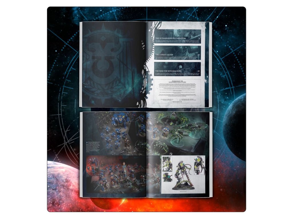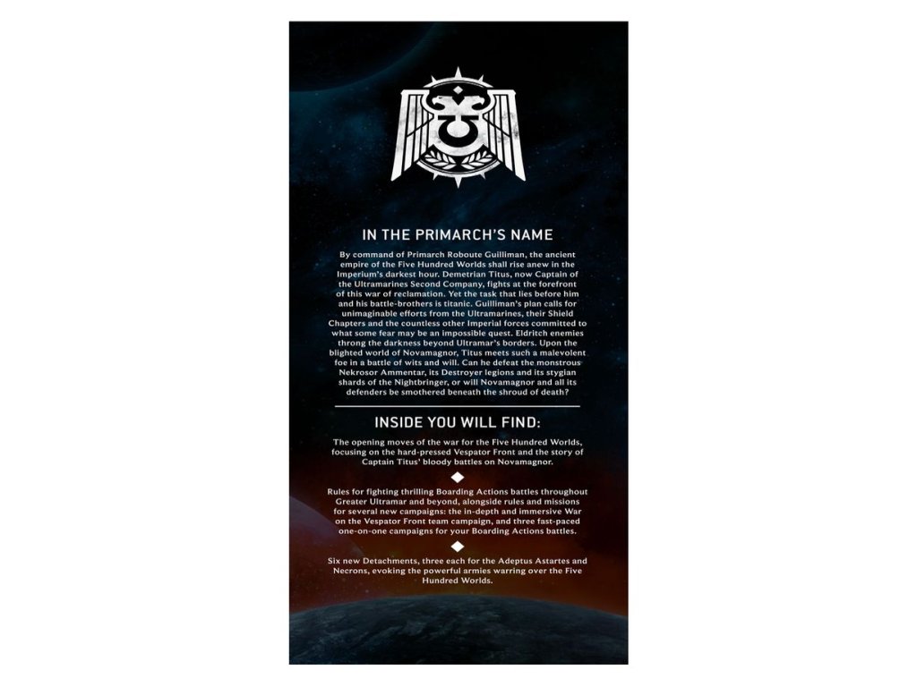 – 500 Worlds: Titus – An 80-page softcover book featuring lore and background about the opening moves to reclaim the 500 Worlds of Ultramar, including the forces marshalled by the Ultramarines and the Necrons.