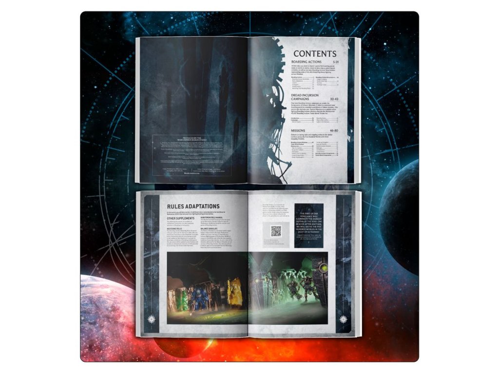 – 500 Worlds: Titus – Dread Incursions – An 80-page softcover book covering boarding actions, giving you all the rules you'll need to play, along with two Boarding Actions Detachments, 12 new missions, and linked campaigns.