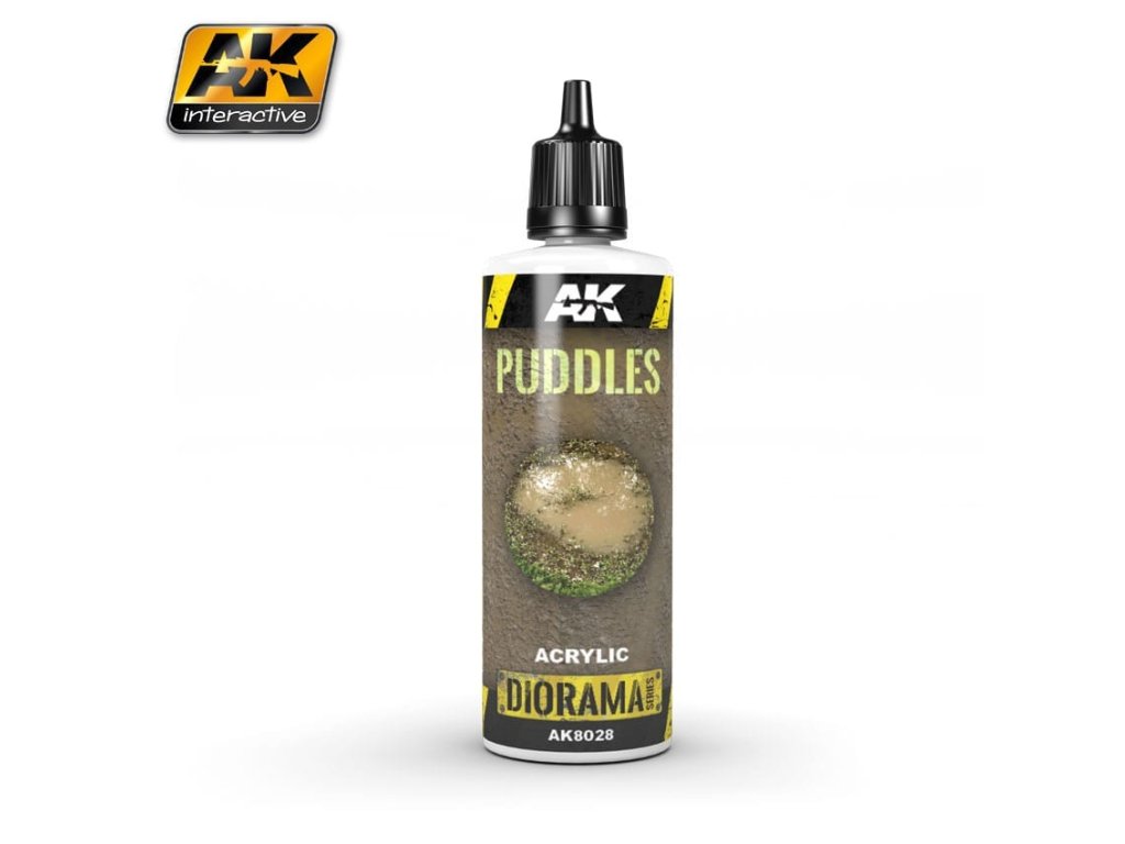 Puddles od výrobce AK Interactive je tekutý krystalický produkt speciálně vytvořený pro realistické napodobení kaluží a stojatých špinavých vod. Puddles je samonivelační a dokáže stékat i po nerovném povrchu vašich podstavců a diorámat. Nanášejte tenké vrstvy od 1 mm do 3 mm. Před zaschnutím můžete pomocí štětce vytvořit velmi realistické textury.
