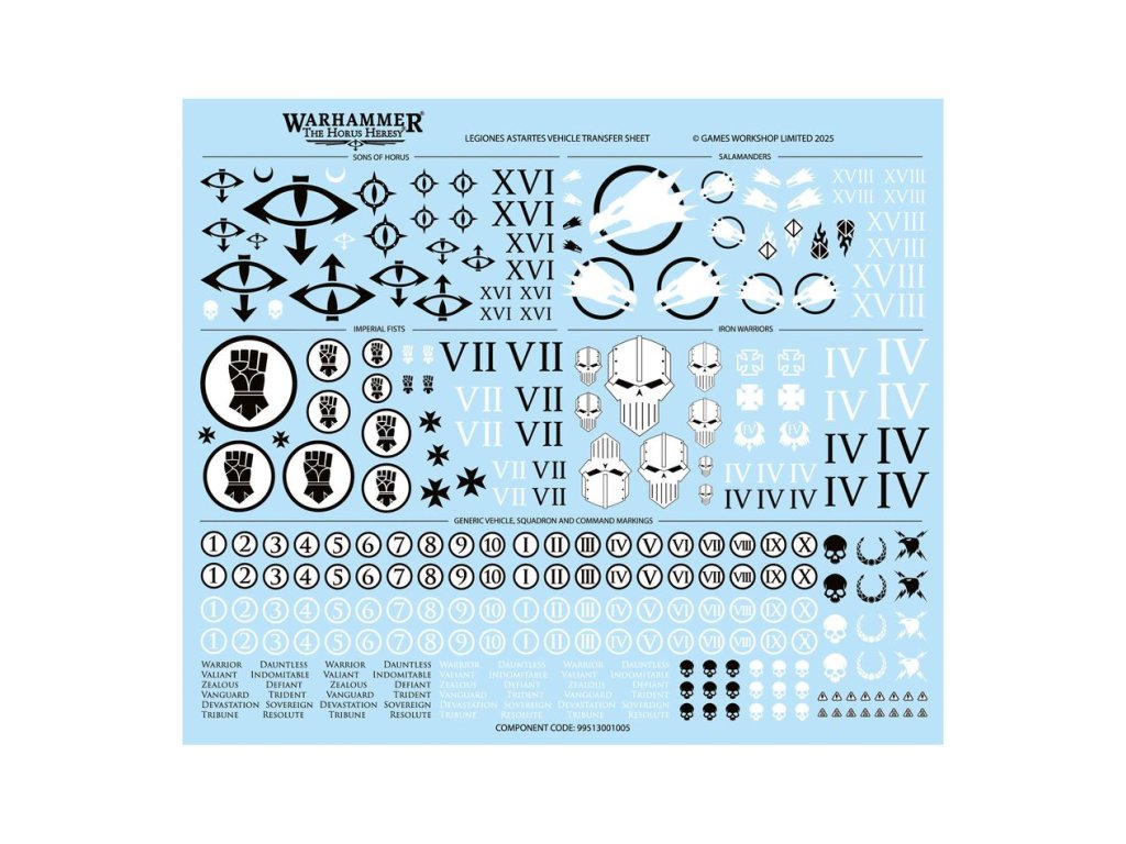 Tato sada obsahuje 92 plastových komponentů a 1 arch pro přenos vozidla Legiones Astartes s 288 vysoce kvalitními obrázky vodních tobogánů – s ikonografií Legie pro Syny Hora, Císařské pěsti, Železné válečníky a Salamandry – pro ozdobení vaší miniatury.
