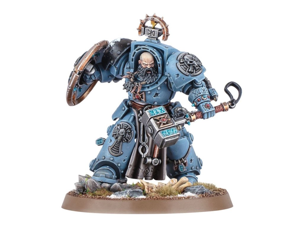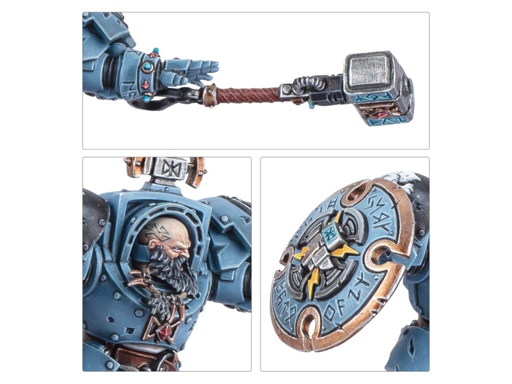 This multipart plastic kit builds Arjac Rockfist, a mighty champion for your Space Wolves armies in games of Warhammer 40,000. Clad in the finest Terminator armour, he is a towering figure – able to go toe-to-toe with the worst horrors of the galaxy and cause grievous damage with his legendary weapon, Foehammer. He can be assembled throwing his hammer forward or brandishing it, ready to strike in melee.