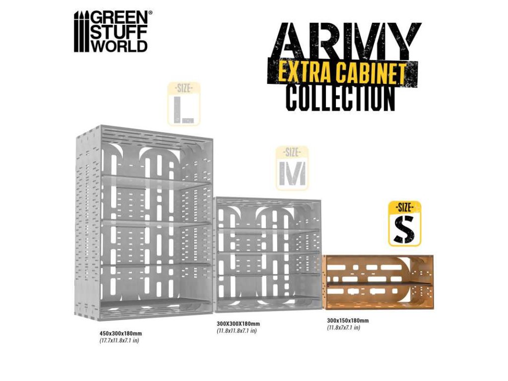 Přídavná skříňka je navržena jako doplněk k přepravě a skladování miniatur. Lze ji použít jak jako další skříňku pro přepravní brašnu GSW Army, tak jako volně stohovatelný úložný systém. Vyrobena z MDF dřeva, pojme více než 54 miniatur rozložených mezi úrovněmi regálů.