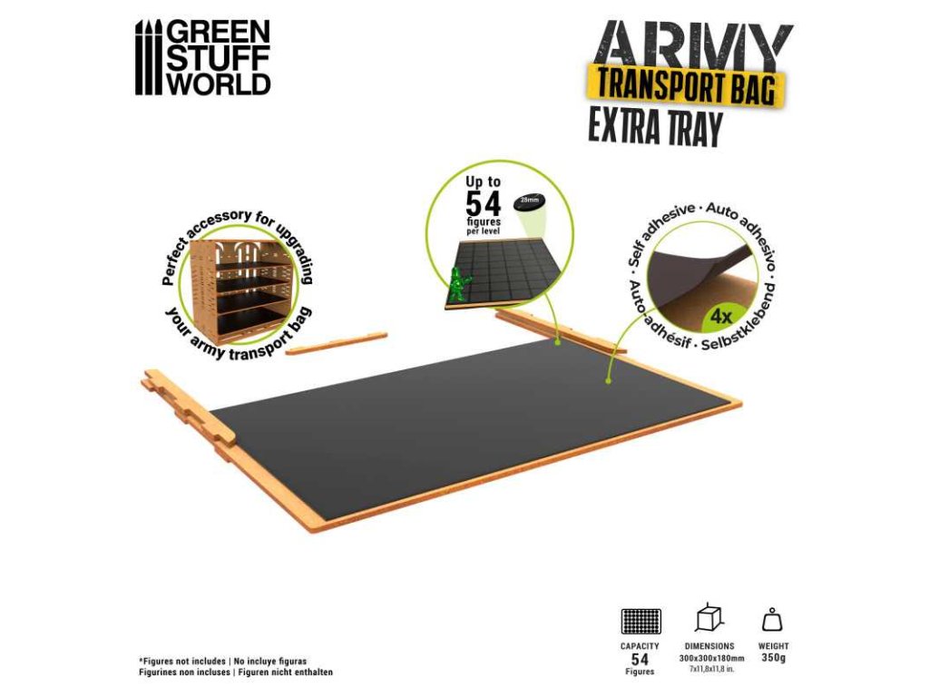 Metalized tray designed to add an additional rack level to the GSW Army Transport Bag and GSW Cabinet storage system, expanding de capacity of your miniature carrying case. Manufactured of MDF wood is capable of accommodating up to 54 medium-sized miniatures.