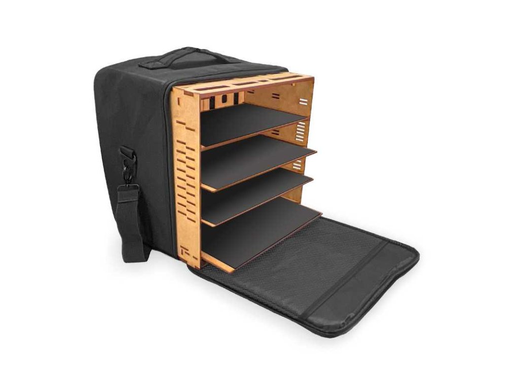 Součástí je zesílená MDF skříňka pro zajištění odolné konstrukce, 4 odnímatelné metalizované tácy, jeden dlouhý popruh a jedno horní madlo pro pohodlnou manipulaci a nakonec 11 nastavitelných výšek pro umístění táců s vašimi miniaturami.