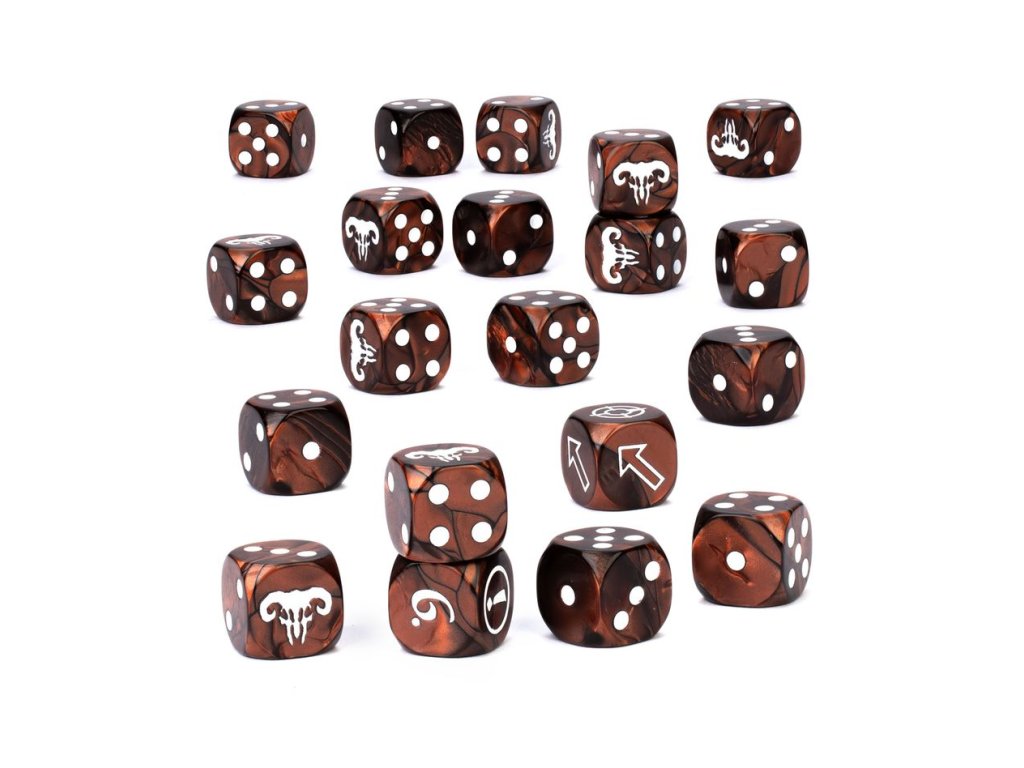 This is a set of 20 round-cornered six-sided dice for use in games of Warhammer: The Old World, themed around the Beastmen Brayherds. They are cast in pearlescent brown acrylic plastic with white markings, and measure 16mm along each edge. On the standard D6s, the 1-5 facings are traditionally pipped and each '6' face is decorated with the bestial icon of the Beastmen Brayherds.