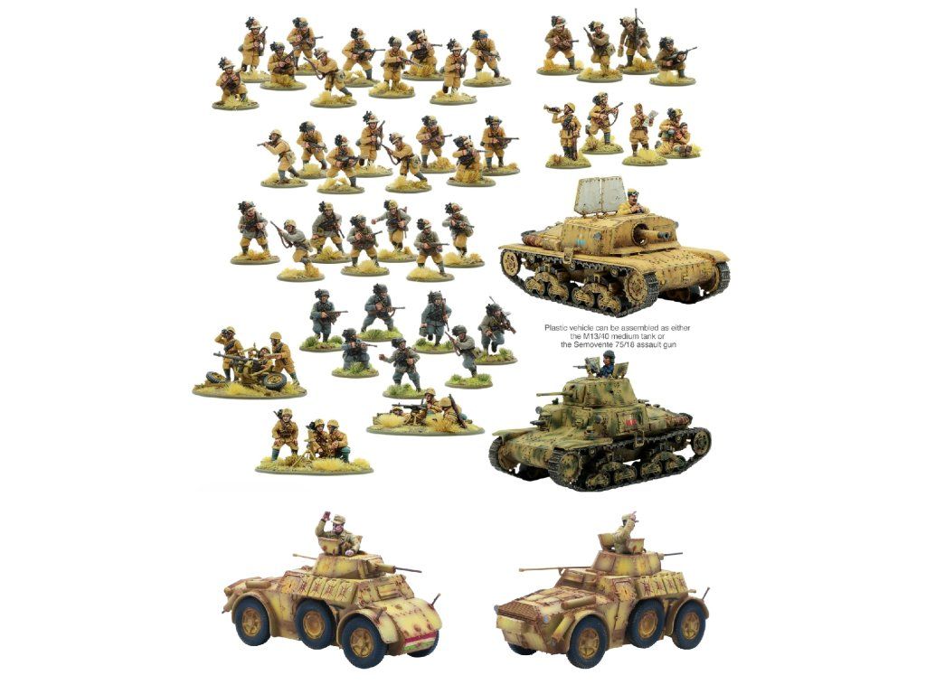 Získejte náskok při shromažďování armády elitních italských vojáků (a jejich brilantně opeřených čepic) s tímto fantastickým balíčkem. Získáte startovací armádu Bersaglieri, která obsahuje 36 plastových pěšáků, střední kulomet, střední minomet a 20mm protiletadlový kanón, střední tank M13/40 (nebo útočný kanón Semovente 75/18, v závislosti na vašich potřebách) PLUS dva nové obrněné vozy AB41.