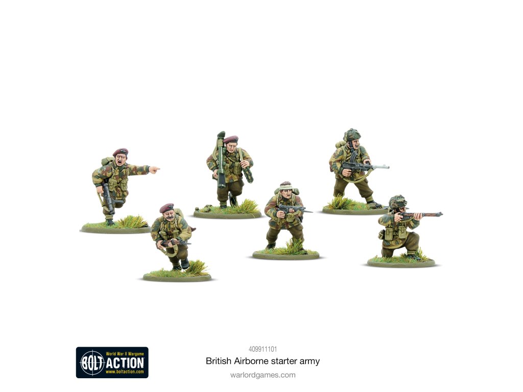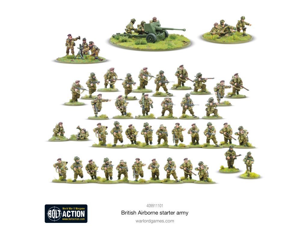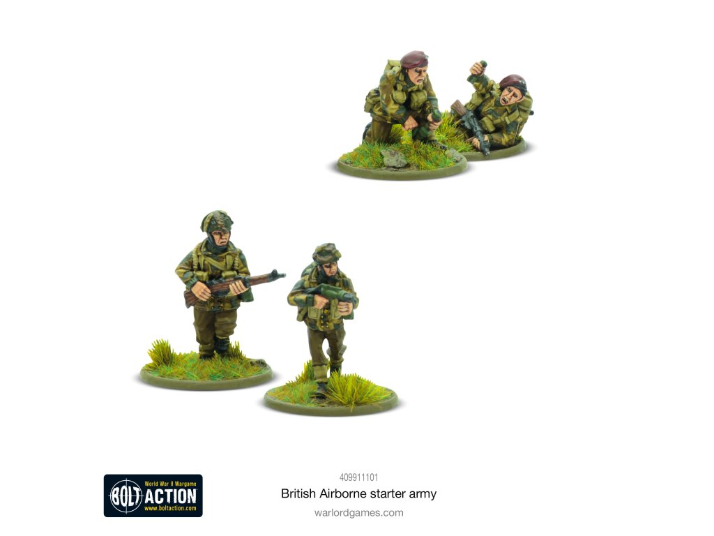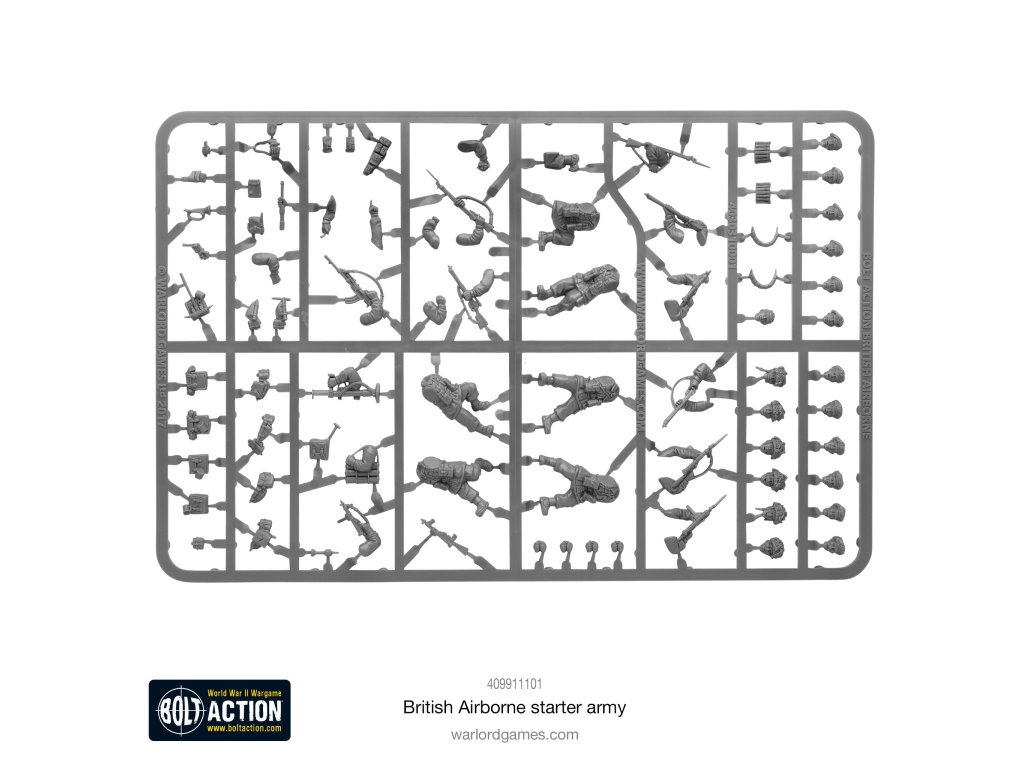 36 plastových pěšáků s výběrem zbraní, včetně lehkých kulometů, samopalů, samopalů PIAT, pušky s puškohledem pro odstřelovače a řadou vybavení pro velitele, jako jsou dalekohledy.