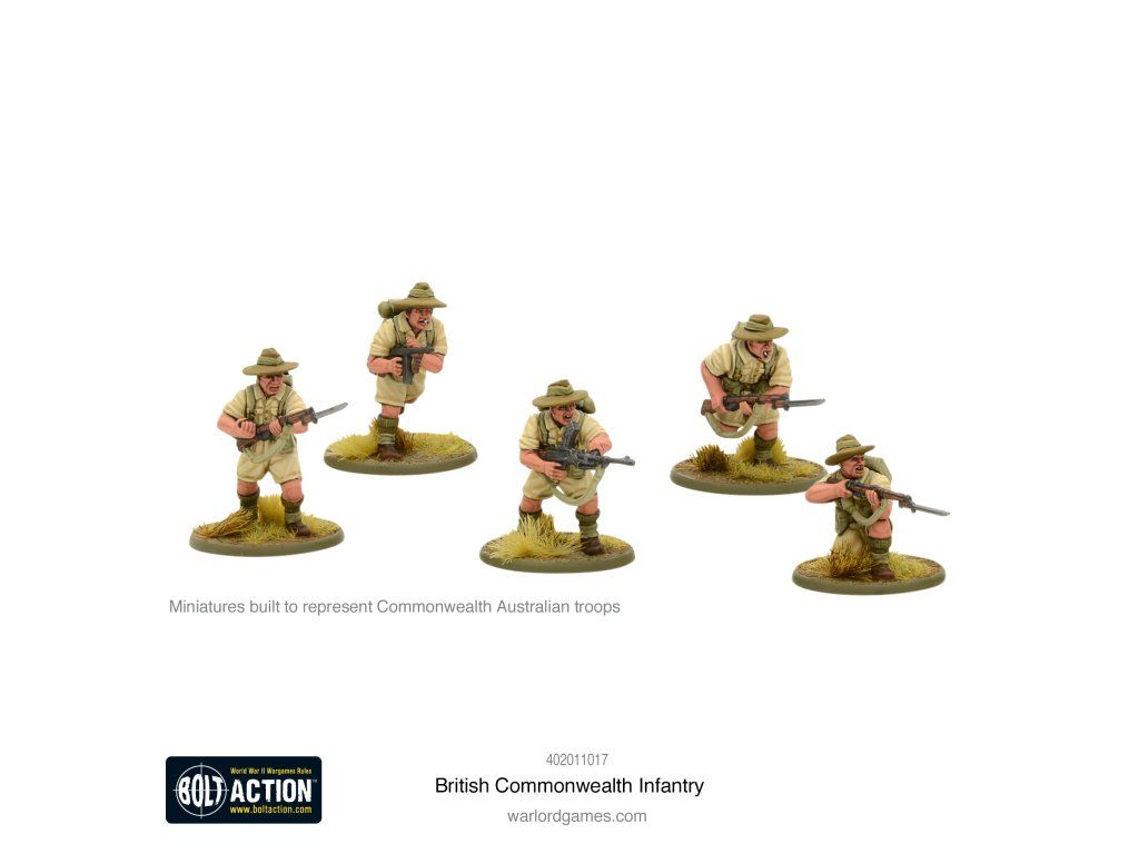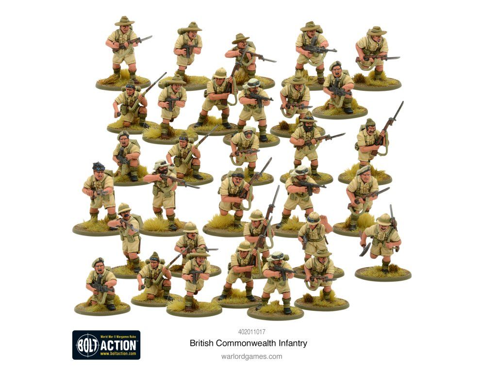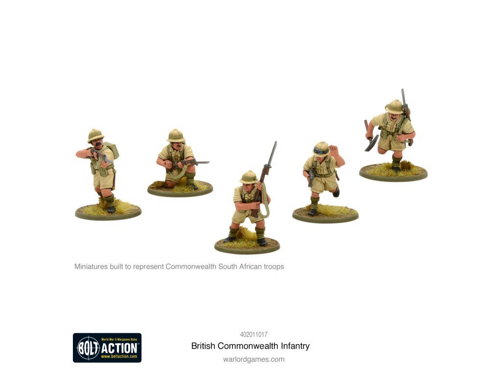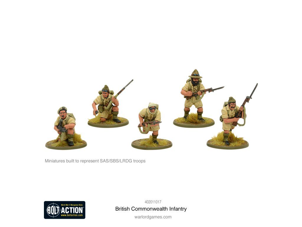 Pěšáci Britského společenství byli obávaným protivníkem, ať už čelili německému Afrikakorpsu nebo italské armádě, ať už to bylo ve vyprahlé poušti severní Afriky nebo v krásném, ale drsném terénu Itálie. Tato krabice s vysoce detailními plastovými miniaturami vám umožní sestavit Australany s ohrnutými klobouky, Jihoafričany v přilbách proti slunci nebo muže z Long Range Desert Group, Special Air Service a Special Boat Service.