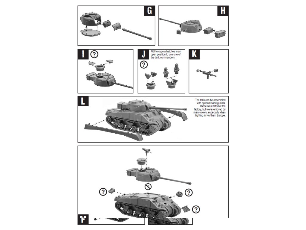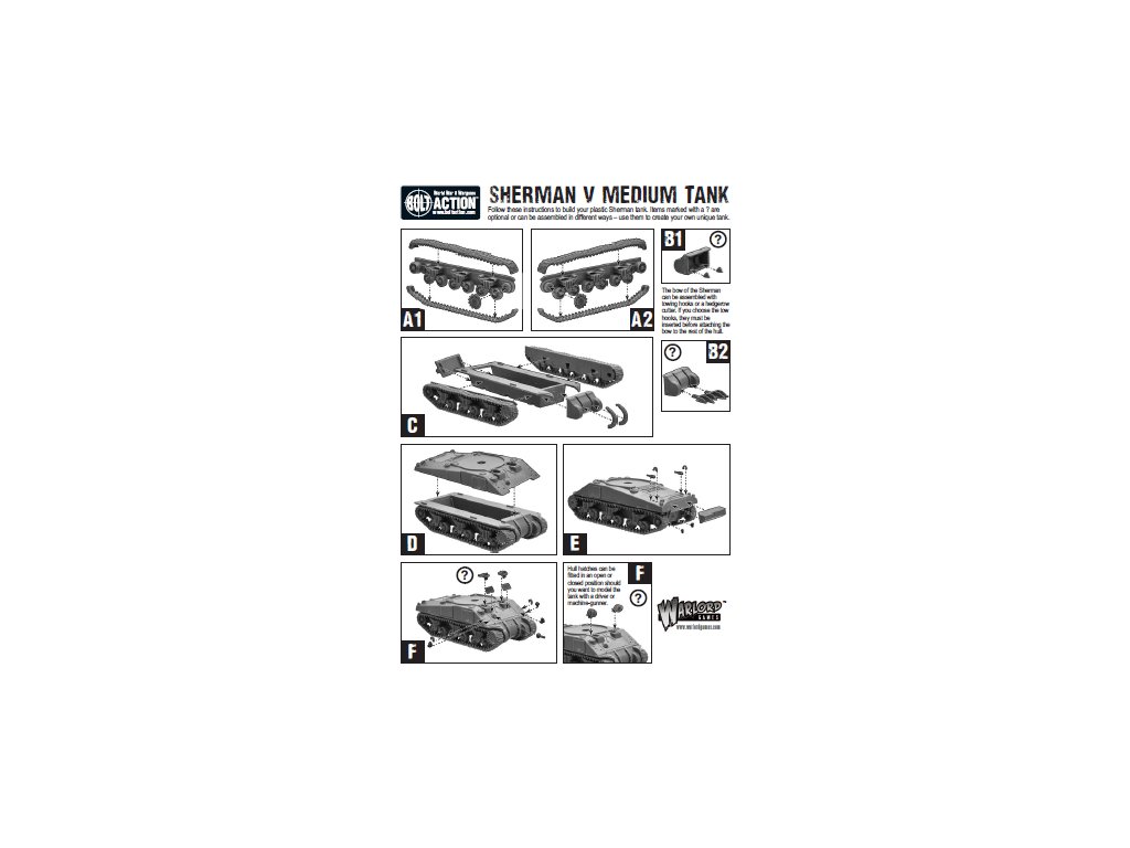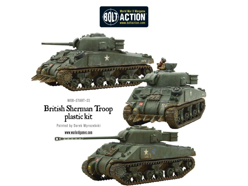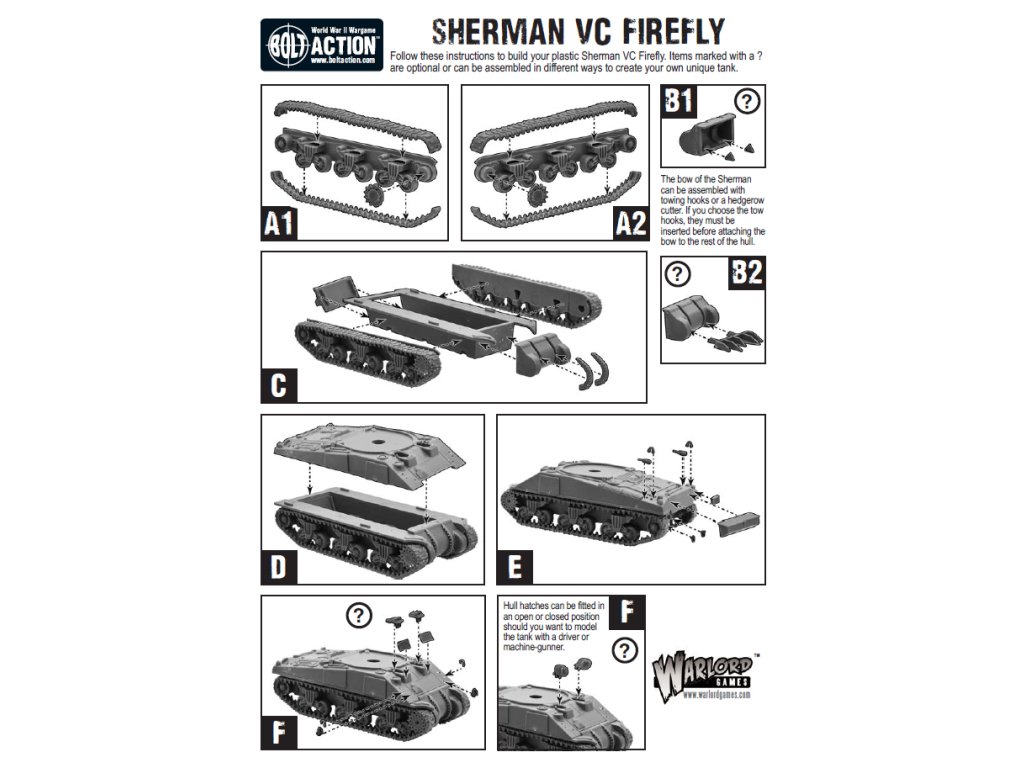 Tato sada obsahuje četu 2 plastových tanků Sherman V a 1 Sherman Vc 'Firefly', ideálních pro obrněné čety ve hrách Bolt Action. Shermany V mají střední protitankový kanón s vylepšeným HE kanónem a 17liberní protitankový kanón Firefly je supertěžký protitankový kanón schopný proniknout veškerým nepřátelským obrněným vozidlem.