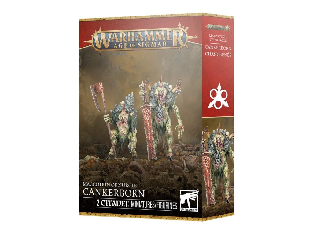 This multipart plastic kit builds two Cankerborn, incredibly durable and strong daemons, and a pair of Pestilent Pollutant markers, for your Maggotkin of Nurgle armies in games of Warhammer Age of Sigmar. Larger and stronger than a Plaguebearer, they wield massive blightblades, easily capable of cutting down any who tries to stop them from spreading their blessings across the land.