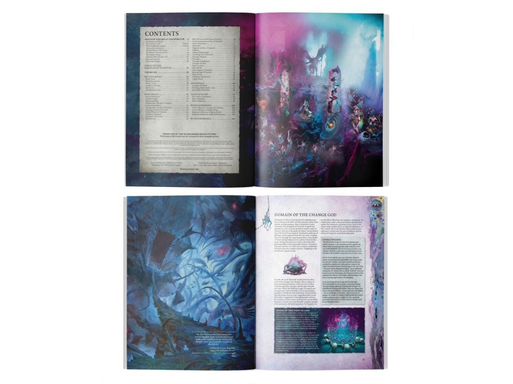 Madness reigns when the Disciples of Tzeentch march to war. Cultists, daemons, and power-seeking sorcerers unleash a kaleidoscopic inferno of eldritch magic, revelling in each immolated soul they offer up to the Change God as tribute. Ever the most manipulative and cunning of the Dark Gods, Tzeentch wallows in the anarchy of the Hour of Ruin – the great onslaught of Chaos that has thrown the realms into disarray. Hidden in plain sight in cities and strongholds, his followers prepare for a great uprising that will crack the skies and twist the earth, unleashing a hellish pandemonium and reshaping reality in Tzeentch’s warped image.
