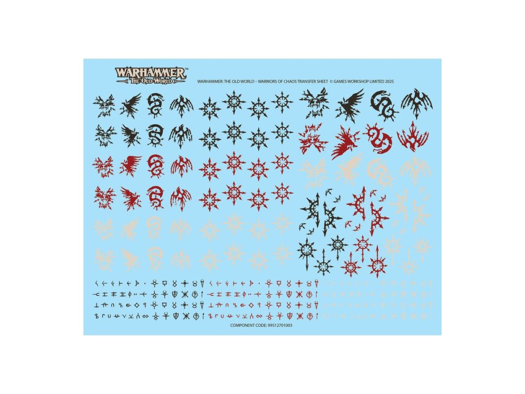 This kit is supplied with 1x Warriors of Chaos Transfer Sheet, containing 246x high-quality waterslide transfers. These include markings for the Cult of the Bloodied Hound, the Cult of the Slithering Serpent, the Cult of the Carrion Crow, and the Cult of the Fell Raptor, along with other Chaos symbols and cursed runes.