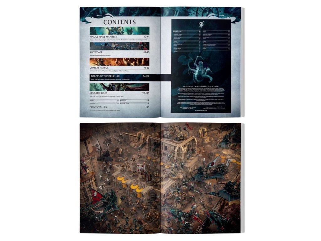 – Pravidla pro používání Drukhari ve hrách Warhammer 40,000, s 23 datovými listy, pěti oddíly a pravidlem Power from Pain pro celou armádu