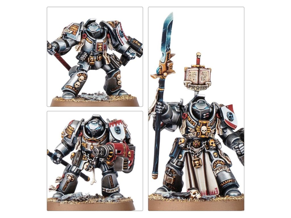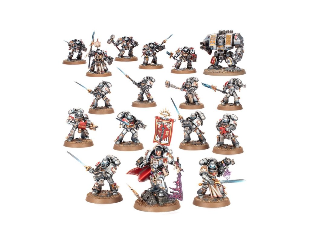 Tato sada obsahuje 17 plastových miniatur Šedých rytířů:– 1x Kastelán Crowe– 10x miniatur Úderné jednotky (které lze alternativně postavit jako miniatury Interceptor, Purifier nebo Purgation Squad)– 5x Terminátory Bratrstva (které lze alternativně postavit jako Paladin Squad)– 1x Ctihodný Dreadnought