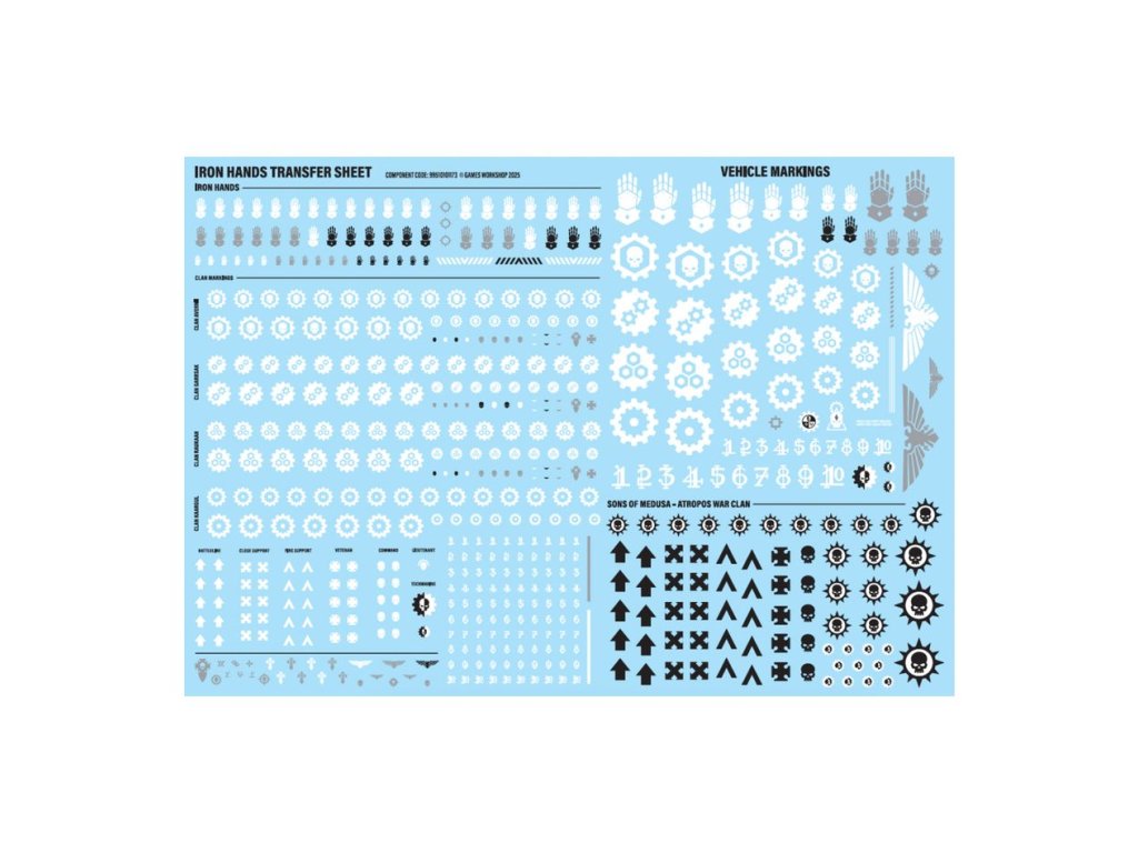 This kit is supplied with a brand new Iron Hands Transfer Sheet, containing 468 high-quality waterslide transfers. These include Chapter icons for the Iron Hands, battlefield role icons, and numbers. They also include iconography for the Atropos War Clan of the Sons of Medusa, Clan Avernii, Clan Garrsak, Clan Raukaan, and Clan Kaargul.