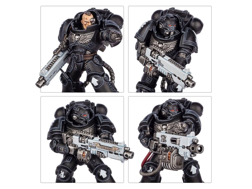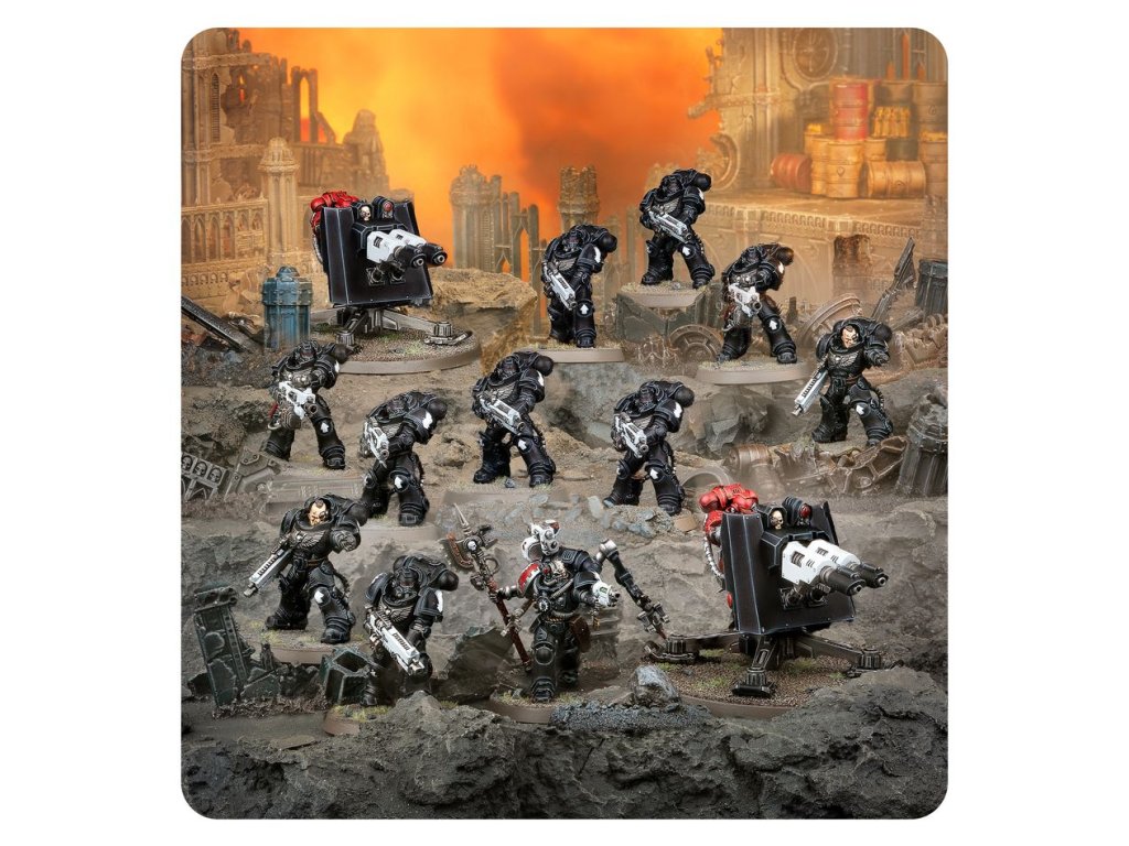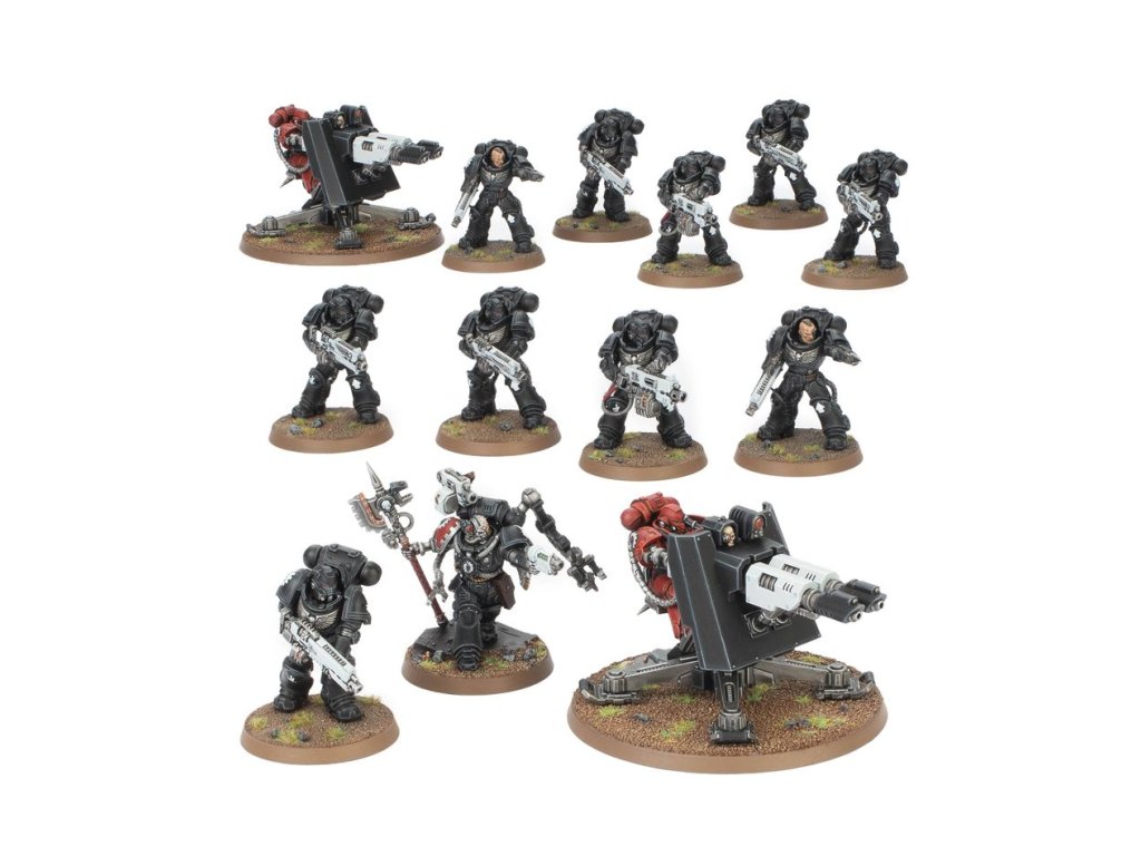 Těžké Intercesory jsou vybaveny těžkými bolterovými puškami a až dvě z nich lze vylepšit pro přepravu těžkých bolterů. Sada obsahuje díly pro sestavení až dvou volitelných seržantů, možnosti narativního zpracování včetně přebíjení zbraně a kosmetické díly, pečetě čistoty, pouzdra na pistole a brašny.