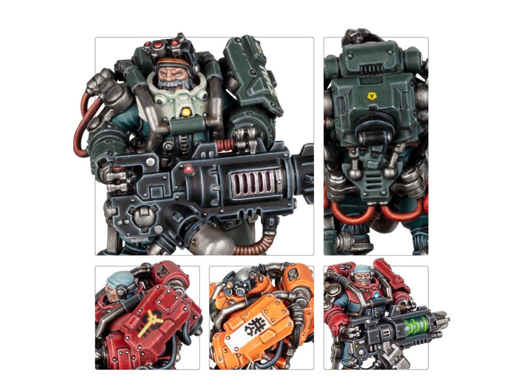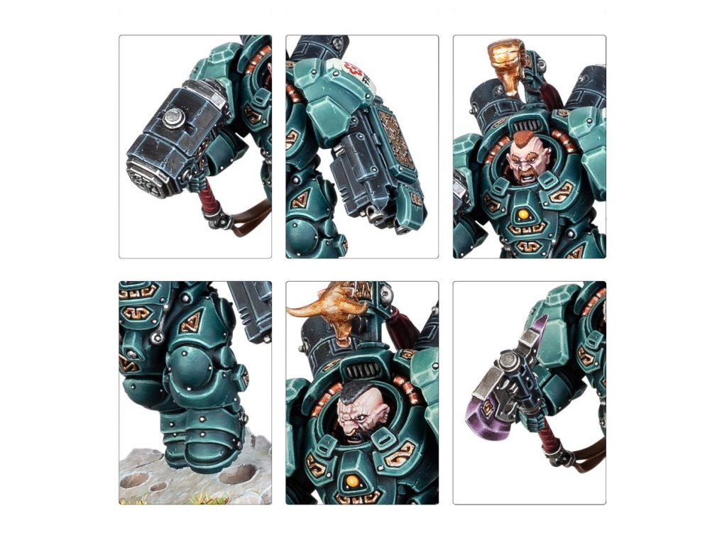 The Einhyr Hearthguard are each equipped with either an EtaCarn plasma gun or volkanite disintegrator, and either a concussion gauntlet or plasma blade gauntlet. There are also parts to build an optional squad leader who can alternatively be armed with a graviton hammer and has a choice of two different crests. There are 19 interchangeable heads, including male, female, and fully closed visors.