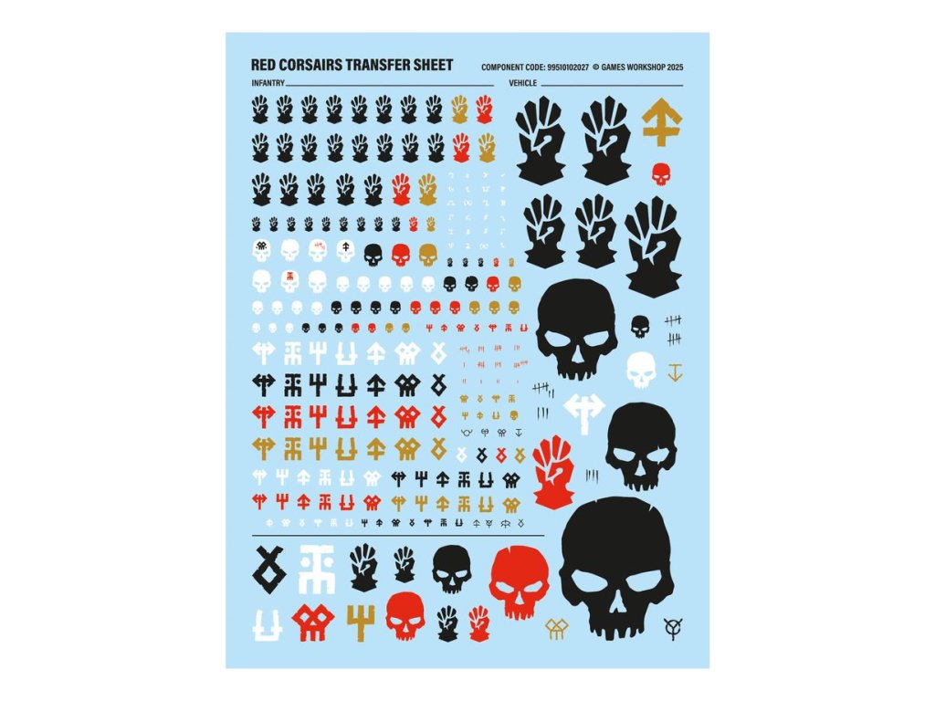 This box also includes 1 Red Corsairs Transfer Sheet, featuring 248 high-quality waterslide transfers. These include a selection of infantry and vehicle-sized transfers depicting Red Corsairs iconography, skulls, kill tallies, and other cursed sigils.