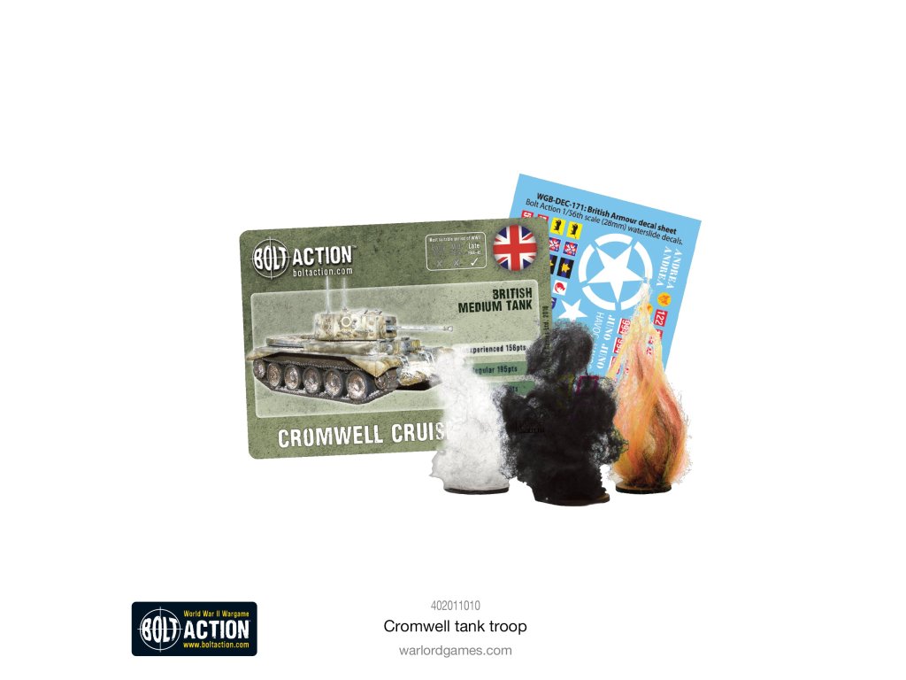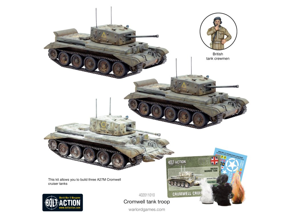 Tanková jednotka Cromwell Obsahuje 3 tanky Cromwell, značky poškození vozidel a kartu statistik Bolt Action.