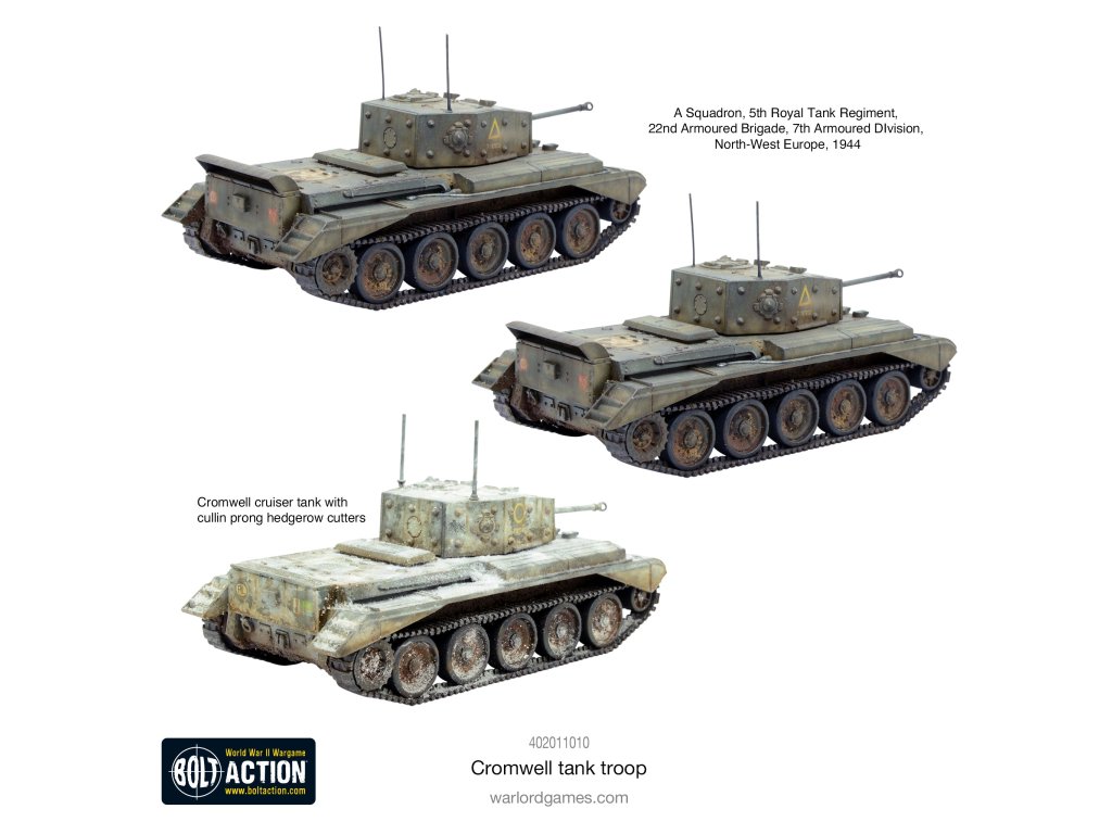 Nejvíce vyráběný křižníkový tank evropského divadla! Vyzbrojen silným 75mm kanónem a dobrými terénními vlastnostmi se toto vozidlo více než vyrovnalo úctyhodnému Panzeru IV! Ačkoli byl bohužel stále překonán německými „velkými kočkami“, Cromwelly byly používány v 7. obrněné divizi a v obrněných průzkumných plucích gardové a 11. obrněné divize. Dokonce i 6. výsadkový obrněný průzkumný pluk získal v Normandii asi 8 Cromwellů a udržel si je během zimních bojů v „Ardenách“.