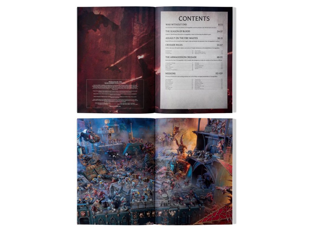 Crusade: Armageddon je narativní rozšíření pro Warhammer 40,000. Podrobně popisuje brutální další kapitolu v pokračující sáze konfliktu zuřícího kolem Armagedonu a bezútěšný stav válečného úsilí. Kniha také obsahuje pravidla pro hraní narativních her, budování a vylepšování křížové armády mezi bitvami a vedení vlastních kampaní.