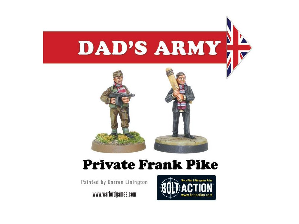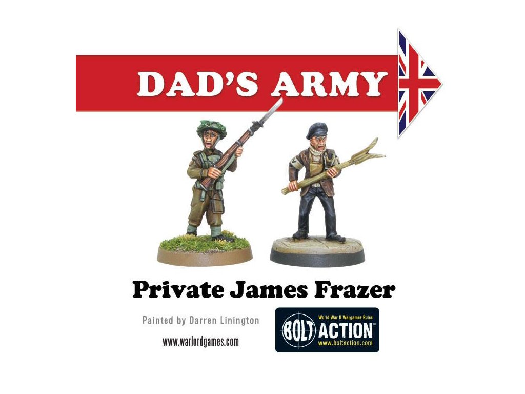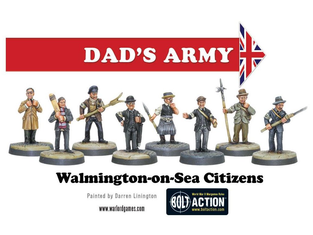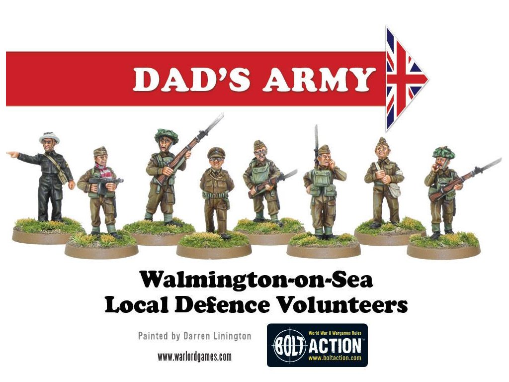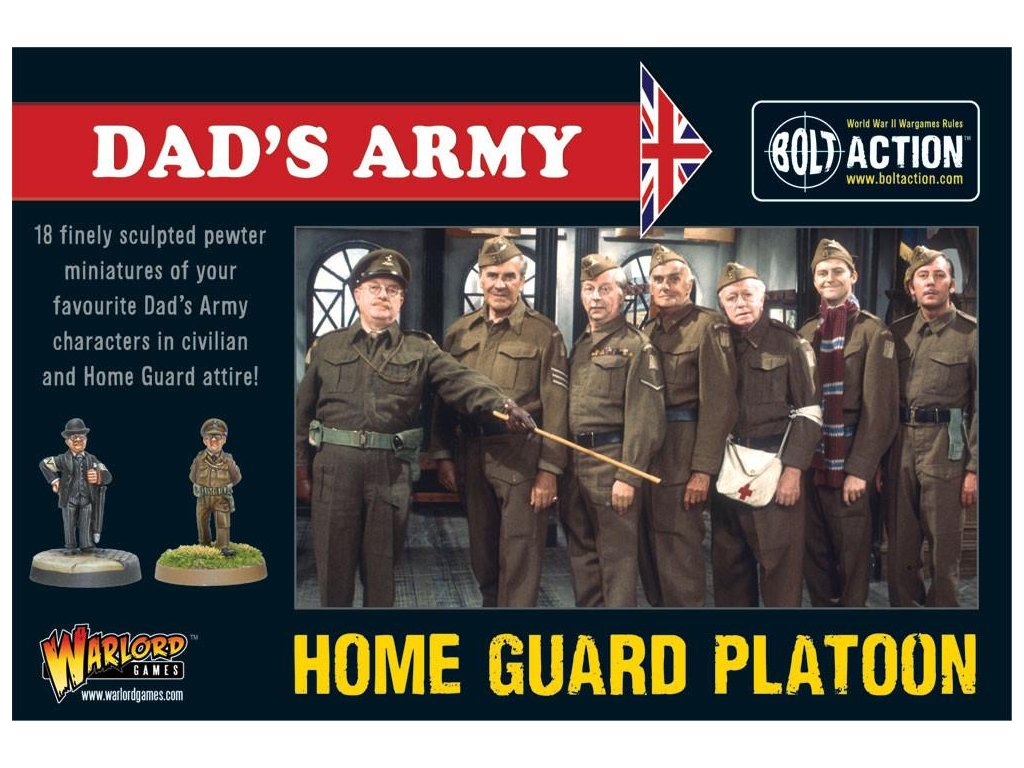 Krabice obsahuje 18 nádherně detailních miniatur od Paula Hickse - znázornění herců klasického televizního seriálu Tátova armáda v civilním a Domobranském oblečení! Součástí jsou kapitán Mainwaring, seržant Wilson, svobodník Jones, vojíni Pike, Walker, Frazer a Godfrey, dále strážce Hodges, kostelník a reverend Farthing.