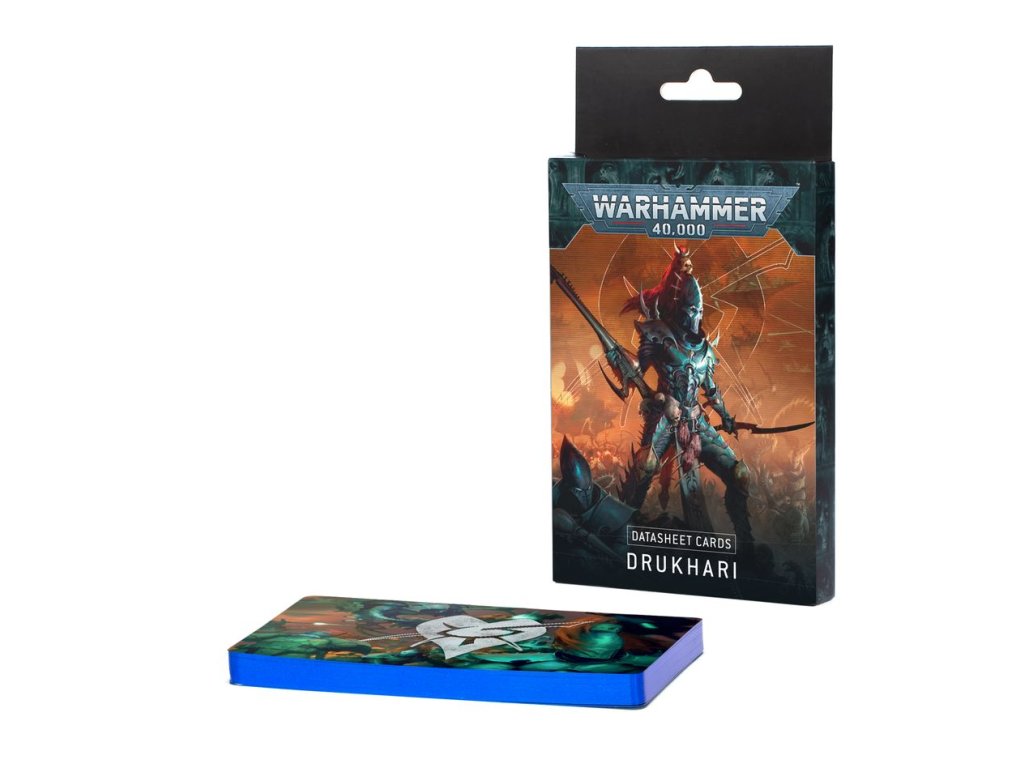 This set of 28 cards will help you keep track of your Drukhari units in games of Warhammer 40,000. There are individual datasheet cards for every unit – detailing their profiles, wargear, options, and special abilities. They are an ideal way to easily check key information in the heat of battle. You'll also find a reference card for the Drukhari army rule and special datasheet cards for use in Combat Patrol games.