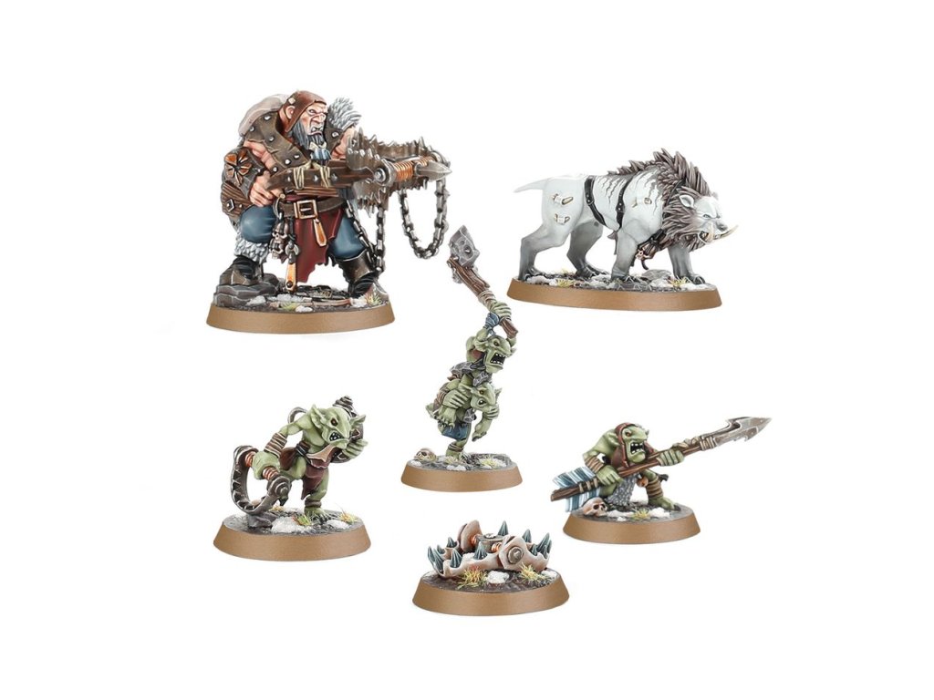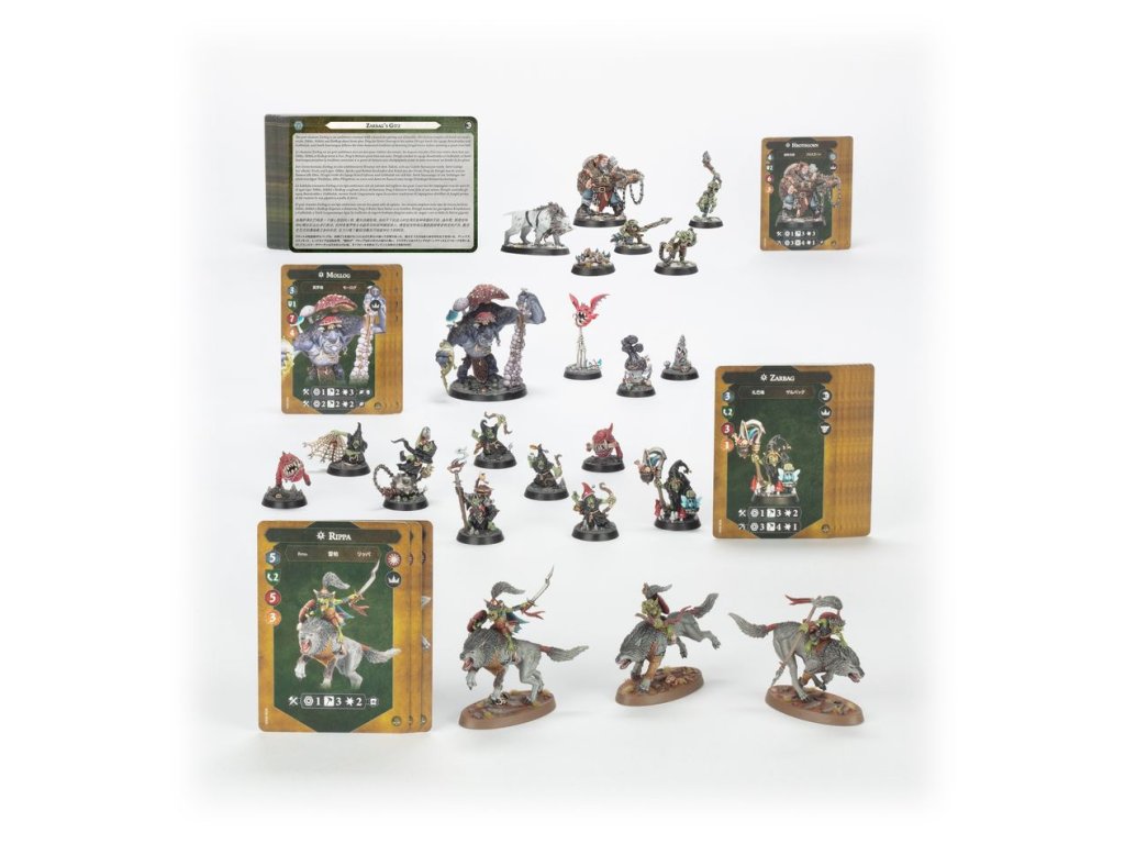 This kit collects four Destruction-themed warbands for Warhammer Underworlds. All the miniatures are push-fit, moulded in coloured plastic, and include scenic bases on the frames so you can start playing quickly. You'll also find warscroll cards and fighter cards for each warband. Hrothgorn's Mantrappers are a versatile Flex warband, Rippa's Snarlfangs are an aggressive Strike warband, Zarbag's Gitz are an ambitious Take and Hold warband, and Mollog's Mob feature the Mastery playstyle, which rewards players for careful management.
