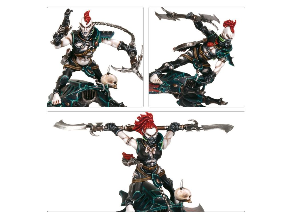 The Helliarch of the Hellions can replace their hellglaive with a splinter pistol, and stunclaw or power weapon. The other members of the unit each have a choice of two heads, and there are further optional cosmetic extras, including skulls, to further personalise your hunting gang.