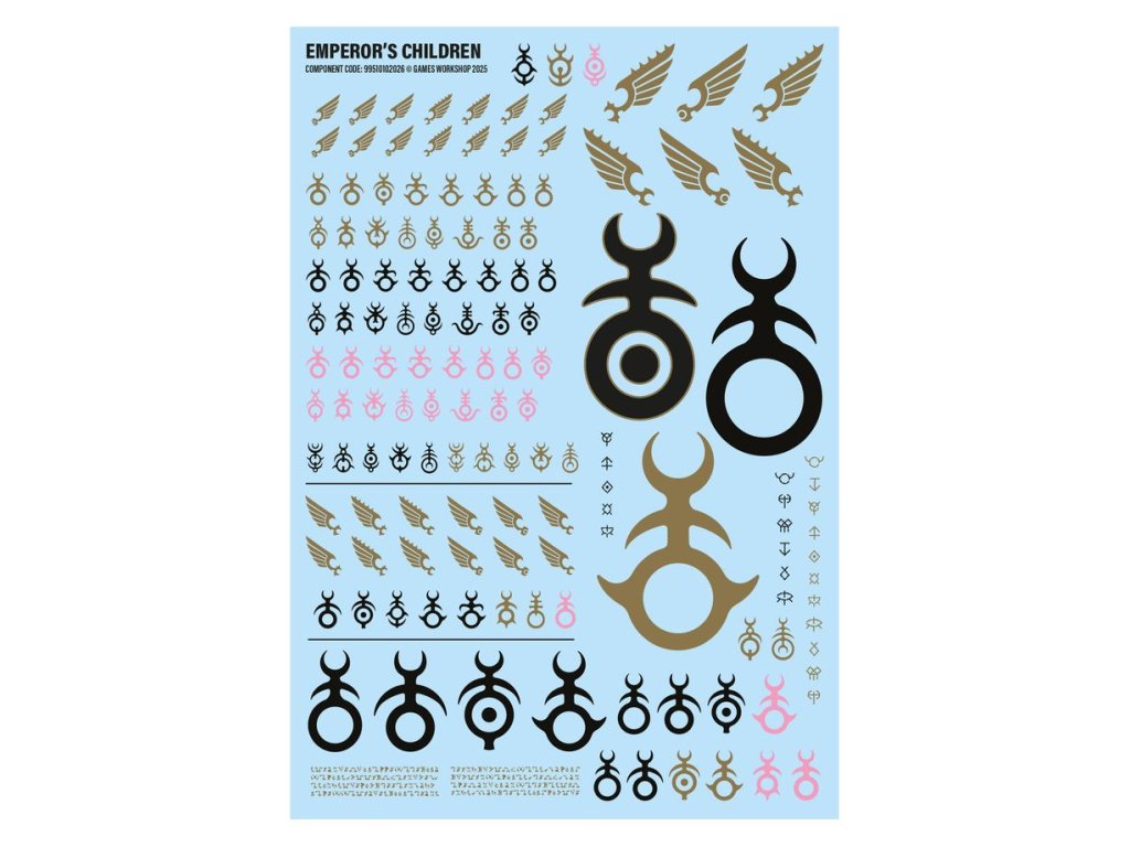 This kit is supplied with 4x Emperor’s Children Transfer Sheets, each containing 150 high-quality waterslide transfers to decorate your miniatures. These include Emperor’s Children symbols in a variety of colours and sizes, plus a selection of twisted Slaaneshi runes and script.