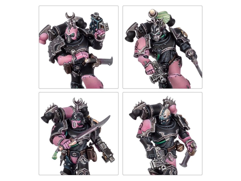 Two of the Noise Marines can be built as an optional Disharmonists, and up to four can be armed with an optional blastmaster. The Disharmonists each have three different heads to choose from, and the Noise Marines have interchangeable heads and shoulder pads – there are 18 helmeted heads, 10 bare heads, 12 Emperor's Children shoulder pads, and 24 standard ones.