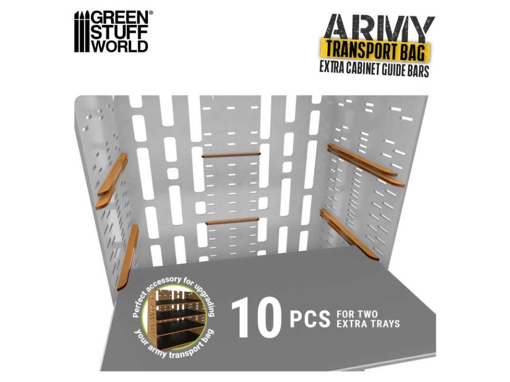 Extra rails to create new heights in your Miniatures Carrying Case or extra cabinet, providing more space to organize and protect your miniatures safely during transport. With them, you can maximize the usefulness of your case, ensuring that all your figures are perfectly in place and protected from damage during travel.