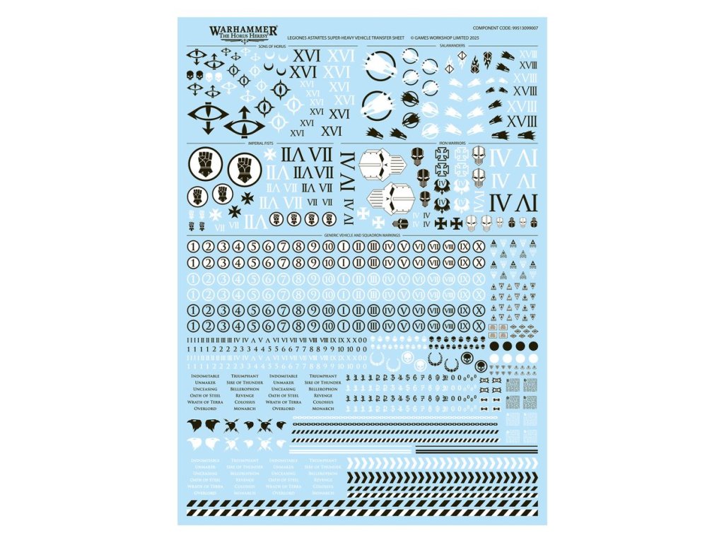 Tato sada je dodávána s 1x transferovým listem Legiones Astartes Super-Heavy Vehicle, který obsahuje 718 vysoce kvalitních transferových vod pro ozdobení vašich miniatur. Součástí stavebnice je ikonografie legie pro Syny Hora, Císařské pěsti, Železné válečníky a Salamandry, spolu s generickými označeními vozidel a letek, číslicemi, vavřínovými věnci a výstražnými pruhy.