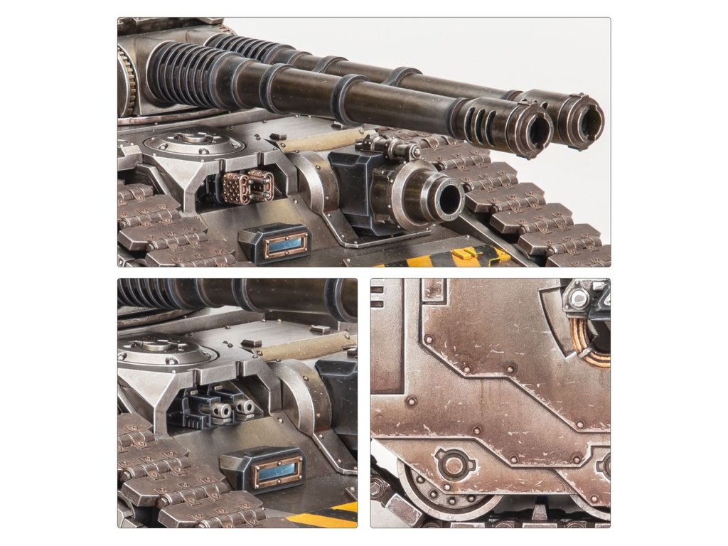 The sponson mounts carry deadly lascannon arrays, which can be replaced with laser destroyers for increased armour-busting capabilities, or Gravis heavy bolter batteries to mow down enemy infantry. The kit also includes components to upgrade the Fellblade with a pintle-mounted weapon – a havoc launcher, heavy bolter, heavy flamer, multi-melta, combi-bolter, combi-flamer, combi-melta, combi-plasma, or combi-volkite – as well as a searchlight, a hunter-killer missile, and cosmetic options such as a choice of gunner, commander, or closed hatch.