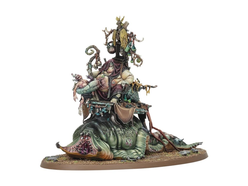 Festus the Leechlord is a heartless maniac, a former plague doctor transformed into a twisted alchemist of disease. His devotion to the Grandfather has seen him swell into a foul Daemon Prince. He leads Nurgle’s armies with infectious enthusiasm on the back of Gathoblyt, relishing the chance to try out new delightful brews on unwilling foes.