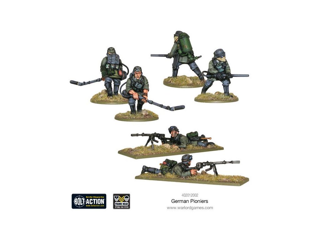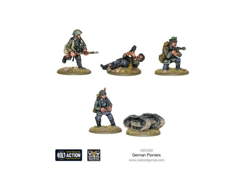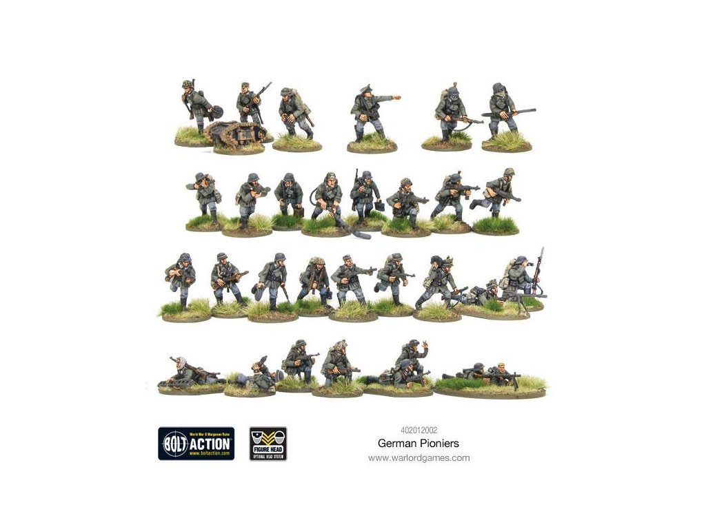 Dostatek plastových a kovových komponentů k výrobě 31 miniatur německých pionýrů. Zahrnuje řadu možností pro různé konfigurace zbraní a modely velení.
