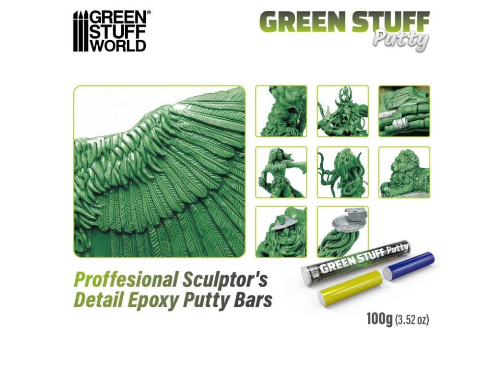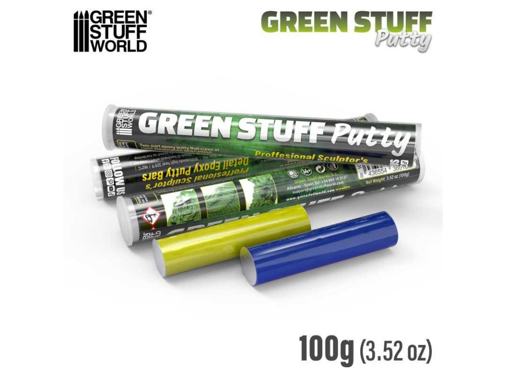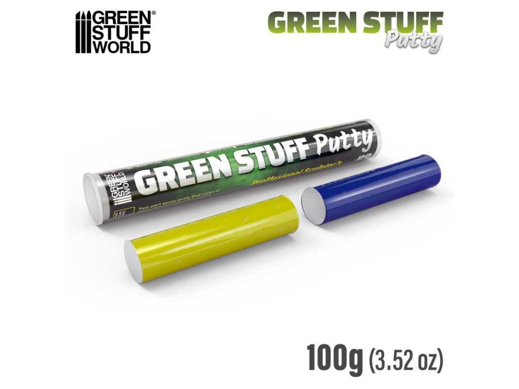 Kneadatite Blue/Yellow Green Stuff je dvousložkový epoxidový tmel, který vytvrzuje při pokojové teplotě a prodává se v kostkové formě.