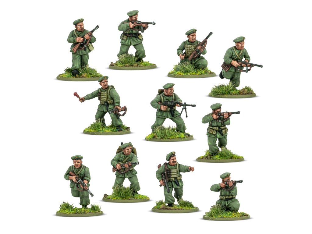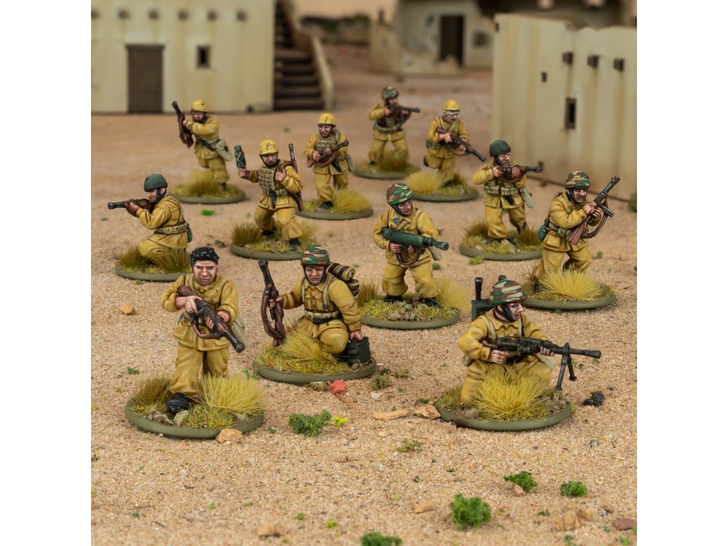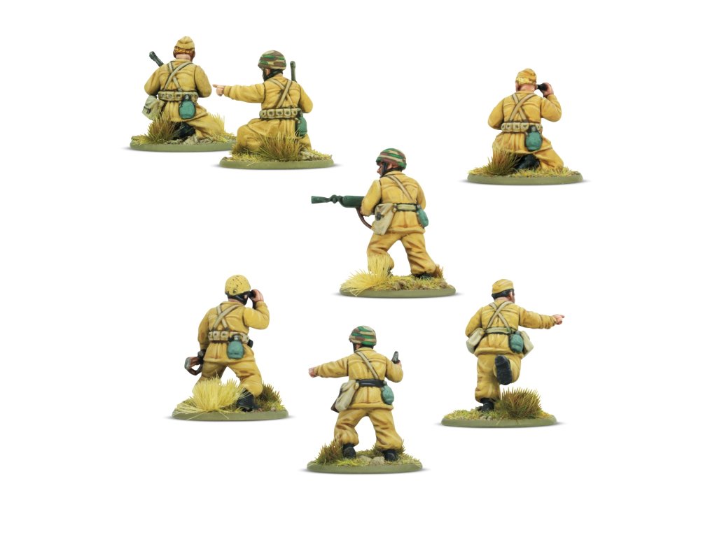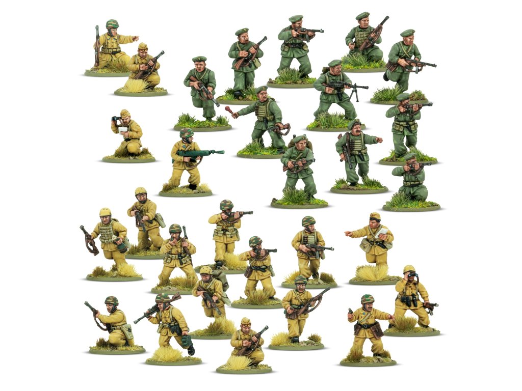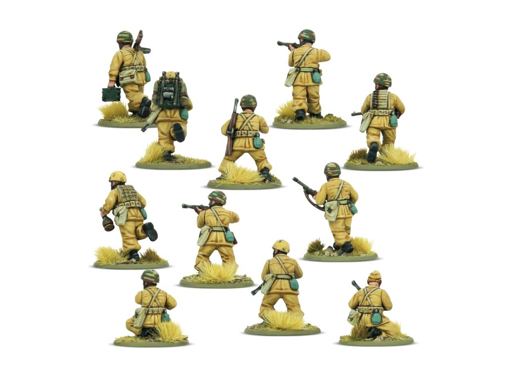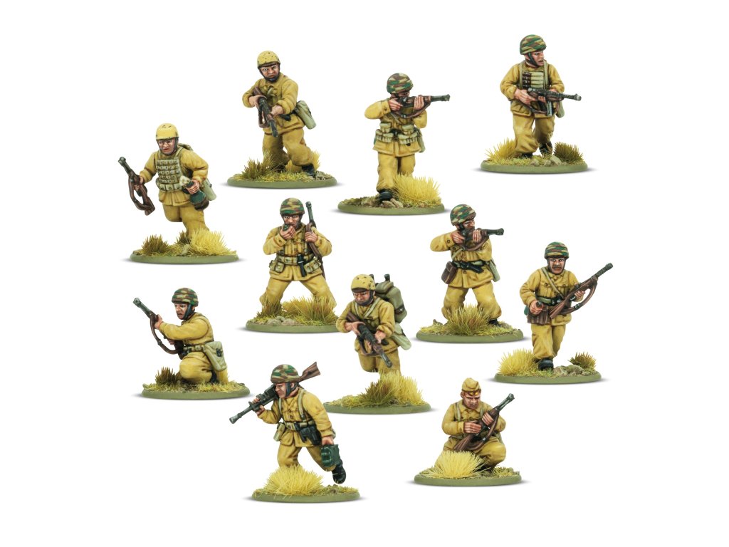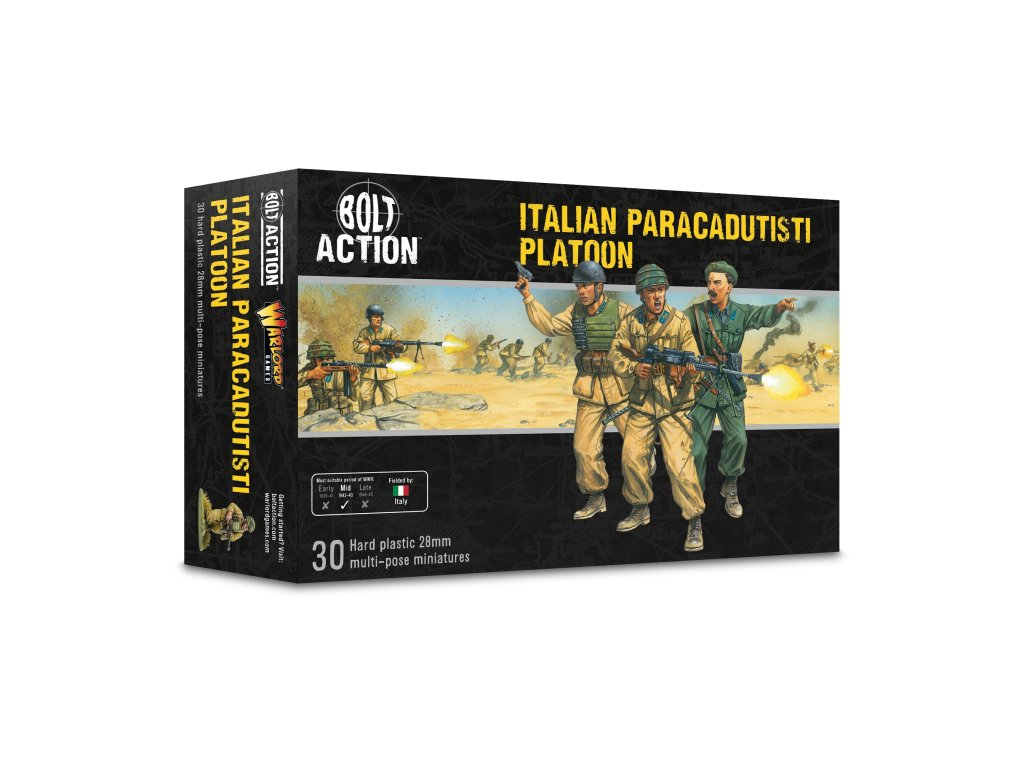 Tato krabice obsahuje 30 modelů pěchoty v uniformách parašutistů M41, což vám umožní sestavit si obrovskou škálu pěchotních jednotek a zbraňových týmů Paracadutisti. Na každém rámečku najdete spoustu zbraní, od všudypřítomné krátké pušky Carcano až po oblíbený samopal Beretta Model 38 a unikátní kompaktní plamenomet Lanciafiamme 41 d’assalto. K dispozici je také nepřeberné množství dalšího vybavení, včetně improvizovaných protitankových granátů a ikonických výsadkových popruhů a vest.