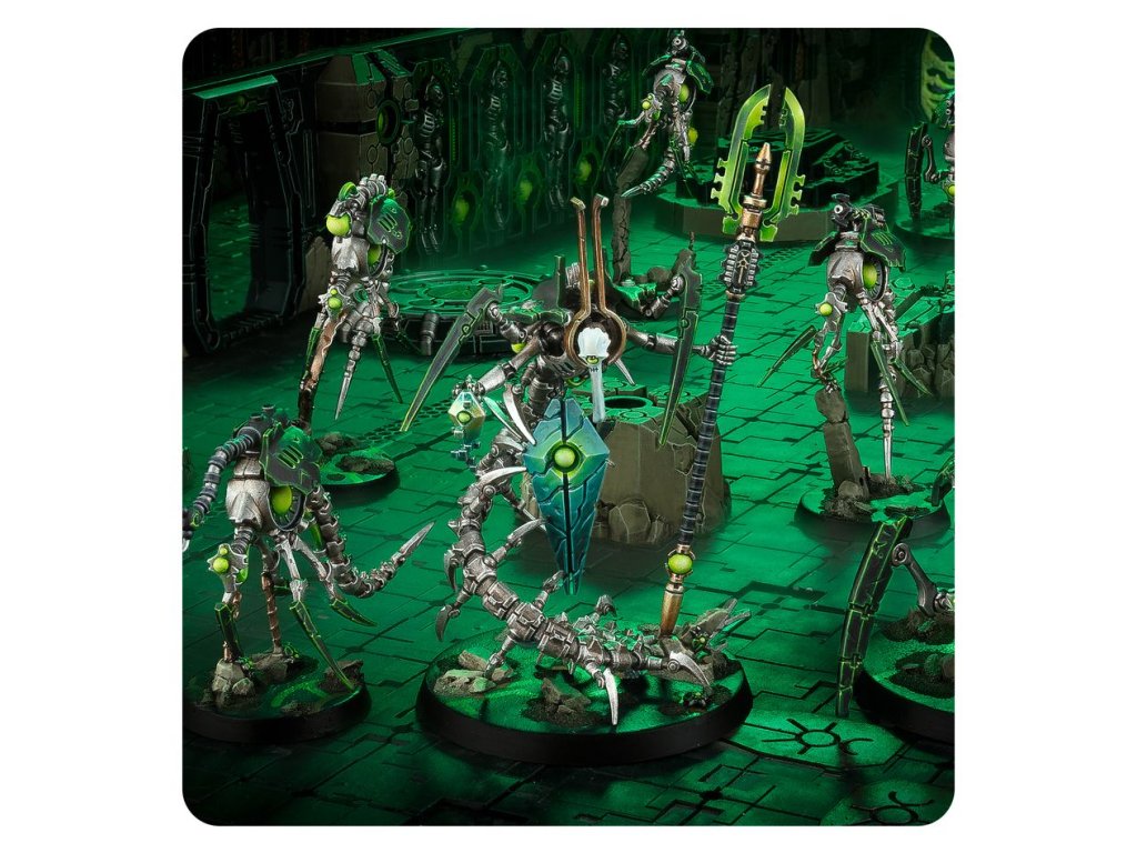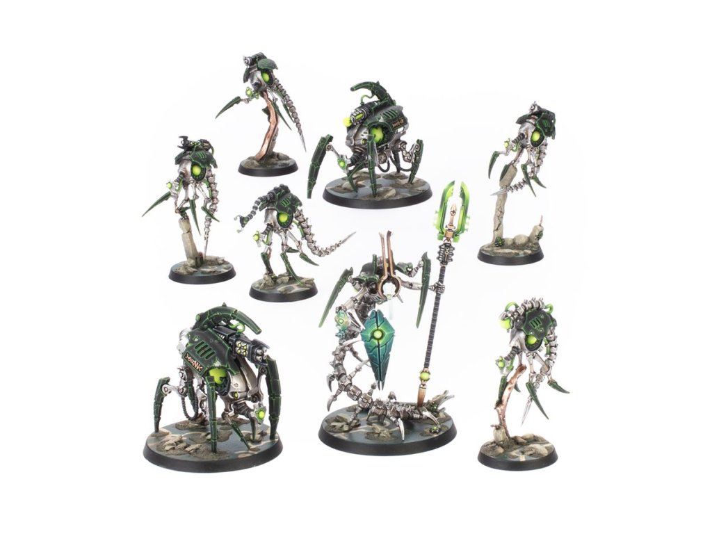 A Canoptek Circle is a unit of sleepless sentinels that defend a Necron Tomb World by tapping into esoteric power matrices to empower their insectile forms. Led by a Cryptek Geomancer, these constructs are extremely difficult to kill, and even when they are seemingly destroyed, they can be quickly repaired and returned to the fight.