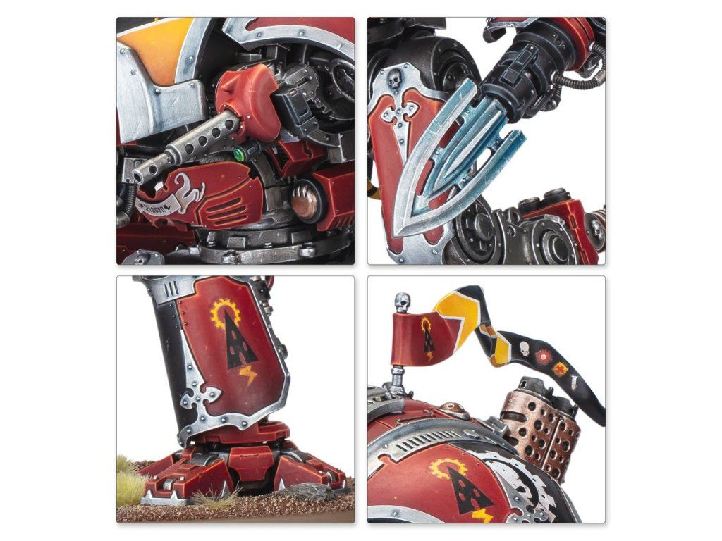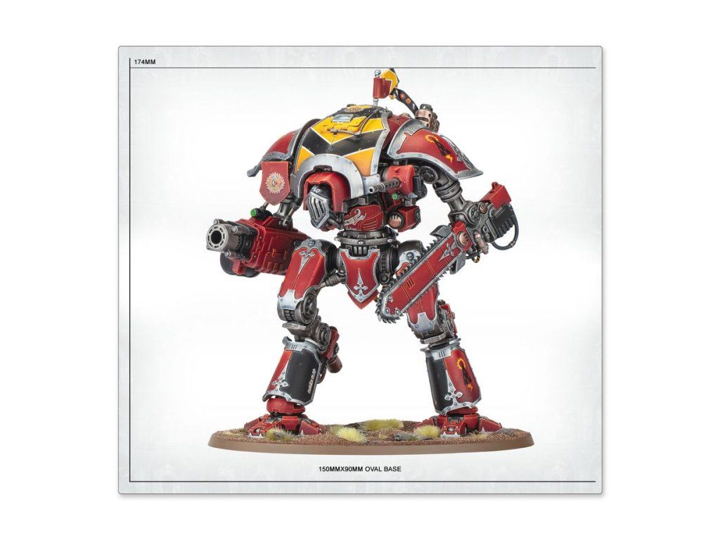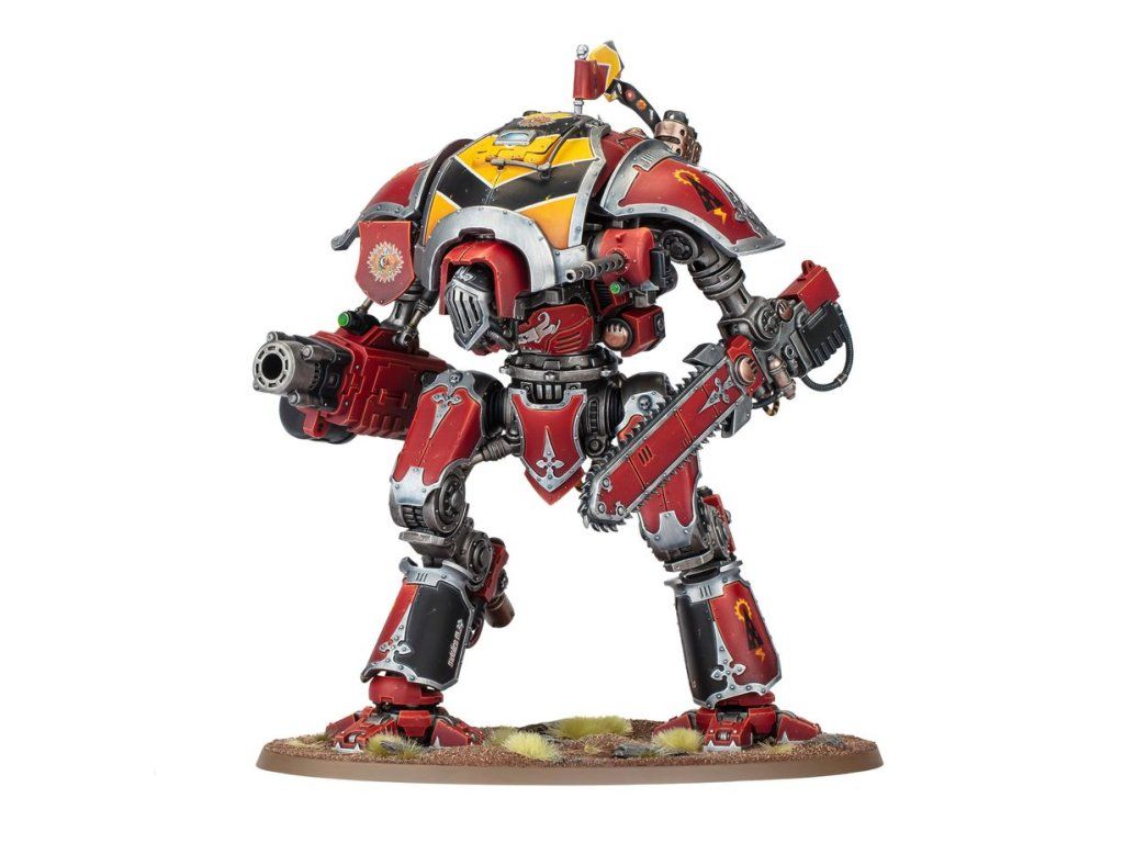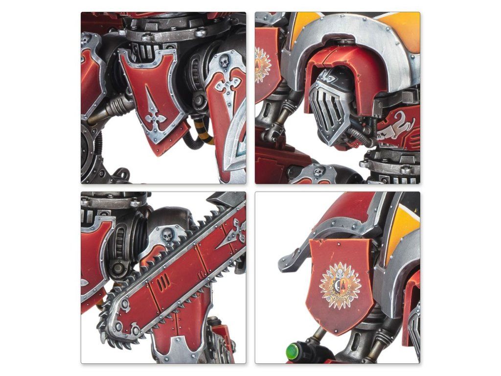 The Knight Destrier is agile and fleet-footed. Employing rocket thrusters, skilled pilots are able to lend greater speed to their charge, tearing into the foe with thundershock spears or reaper chainswords before mowing down what remains of their enemies with hails of chastiser gatling rounds or explosive munitions from their frag bombards.