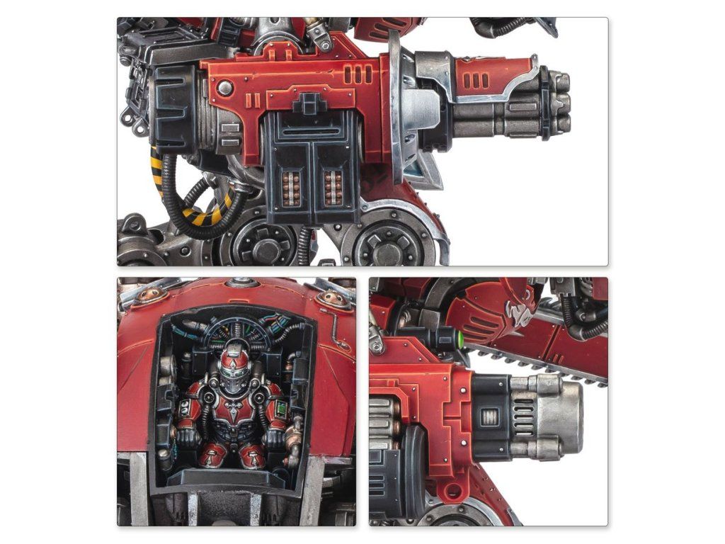 There are 2 straightforward poses for the legs, and an advanced option for more experienced Warhammer hobbyists. The kit includes 3 different face masks, and the hatch can be built closed or open, showing off the detailed interior and pilot. It can be armed with either a multi-barrelled heavy calibre chastiser gatling cannon to sweep aside infantry, or an explosive shell-firing frag bombard. To accompany this is an oversized rocket-assisted thundershock spear to punch clean through reinforced armour, or a versatile reaper chainsword to scythe through hordes or gut monstrous creatures with a single blow. These weapons can be mounted on either arm, making it easy to customise your devastating war machine, and the thundershock spear has 2 assembly options.