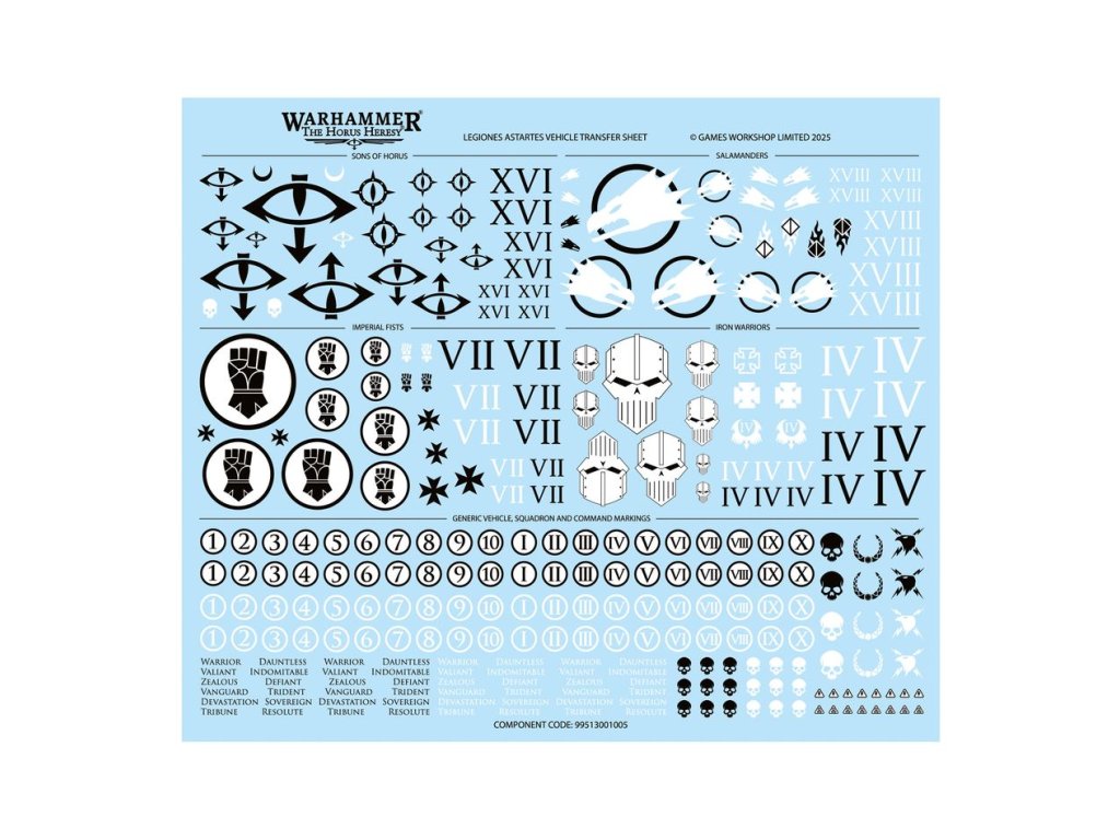 Tato sada obsahuje 89 plastových komponentů a 1 arch pro transfer vozidel Legiones Astartes s 288 vysoce kvalitními transfery vodních tobogánů – s ikonografií Legie pro Syny Hora, Imperiální pěsti, Železné válečníky a Salamandry – pro ozdobení vašich miniatur.
