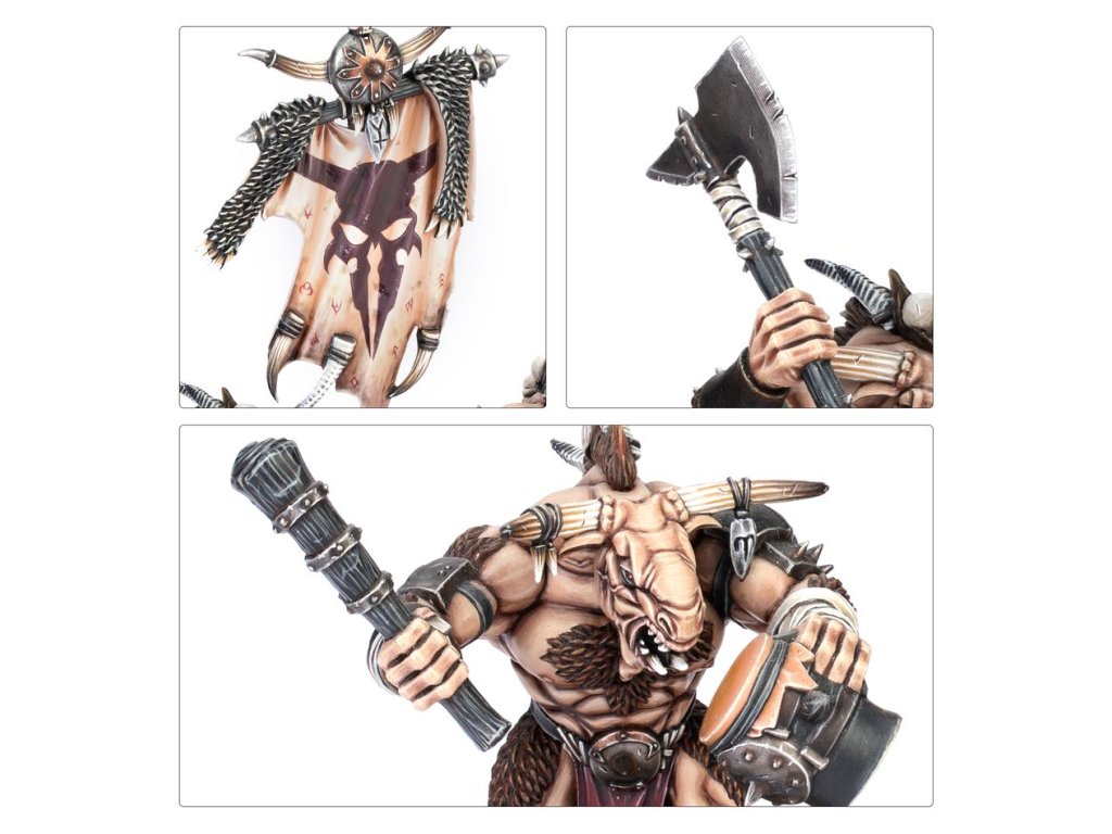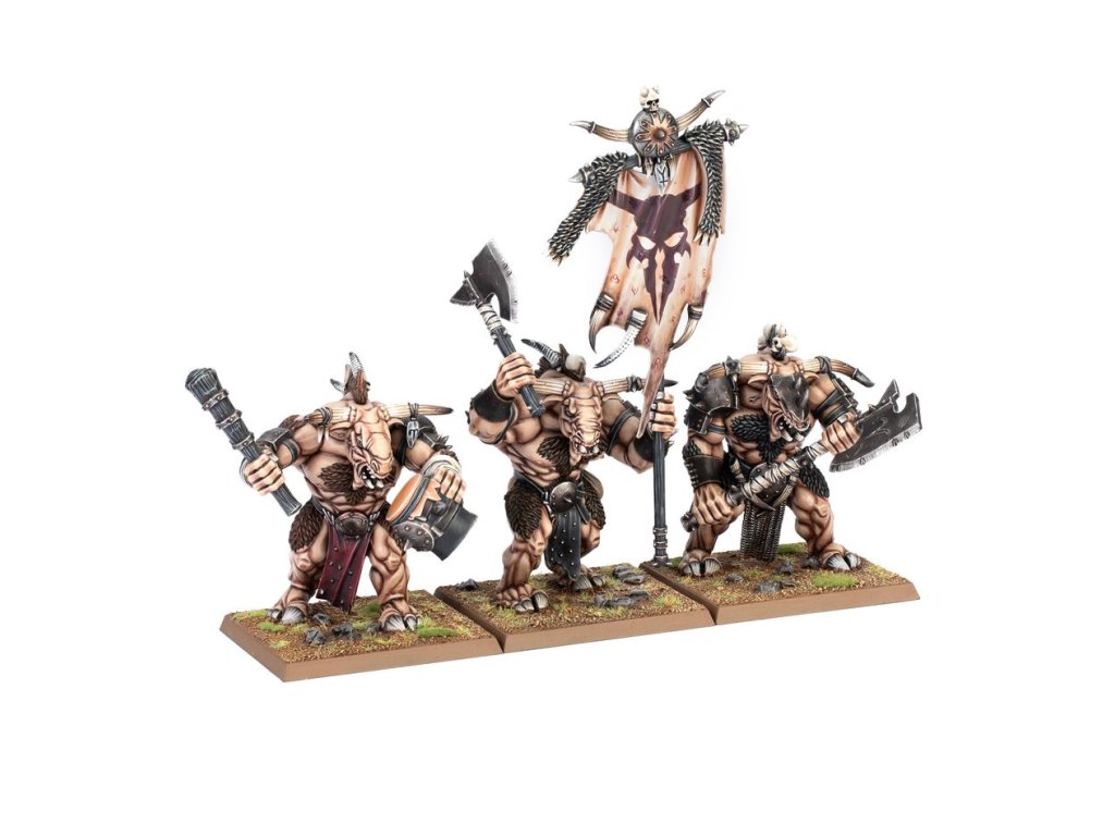 These hulking brutes can be armed with great weapons, a pair of hand weapons, or a hand weapon and shield for extra durability. There are also parts to build an optional champion, standard bearer, and musician. The standard bearer has a choice of two different banner toppers, and the six sets of horns, five heads, five manes, weapons, and shields in the kit are interchangeable across the bodies, making it easy to customise your units.