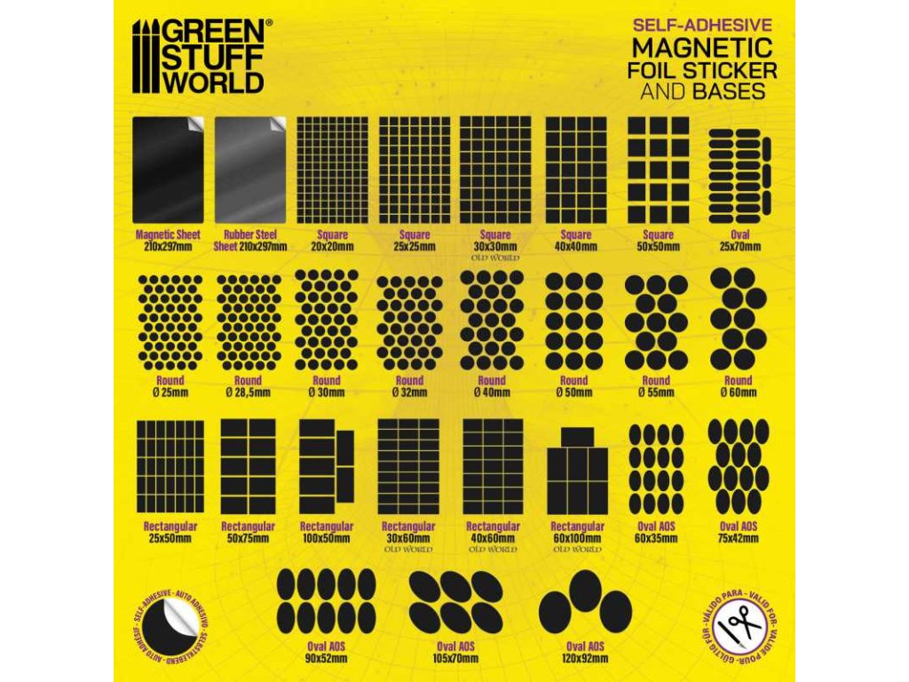 Samolepicí flexibilní magnetické listy poskytují rychlý a jednoduchý způsob zmagnetizace vašich herních jednotek bez nutnosti vrtání základů a lepení magnetů. Nejběžnější tvary jsou čtvercové, obdélníkové, kulaté a oválné, ale také jako celé listy, které lze pohodlně stříhat nůžkami nebo nožem na řezání.