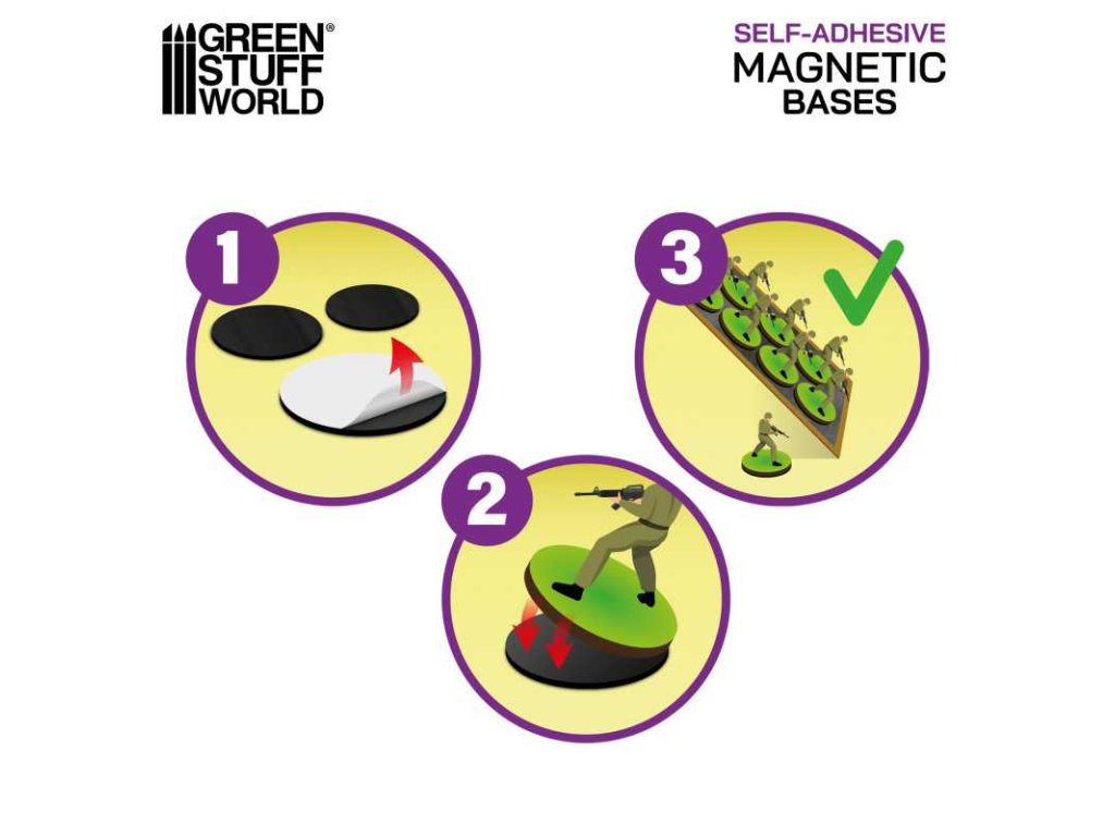 Používejte je samostatně, společně s našimi gumovými ocelovými listy nebo společně s našimi neodymovými magnety v závislosti na požadované síle přitažlivosti. Použití figurek na magnetické bázi vám umožňuje umístit velké jednotky na desku stolu na jejich pohyblivé podnosy jako jeden kus. Tím se eliminuje čas strávený přesouváním figurek jednu po druhé po stole. I když se podnosy narazí nebo převrátí, máte dobrou šanci, že vaše figurky zůstanou připevněné a nepoškozené. Aplikace je velmi snadná. Jednoduše sejměte ochranný papír ze spodní strany magnetické fólie a nalepte jej na spodní stranu základů.