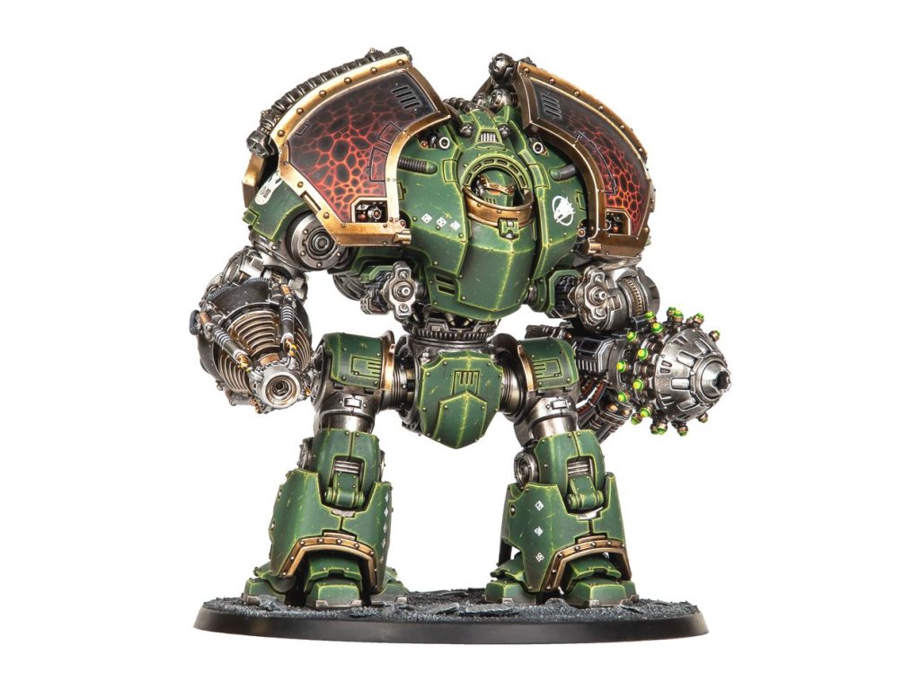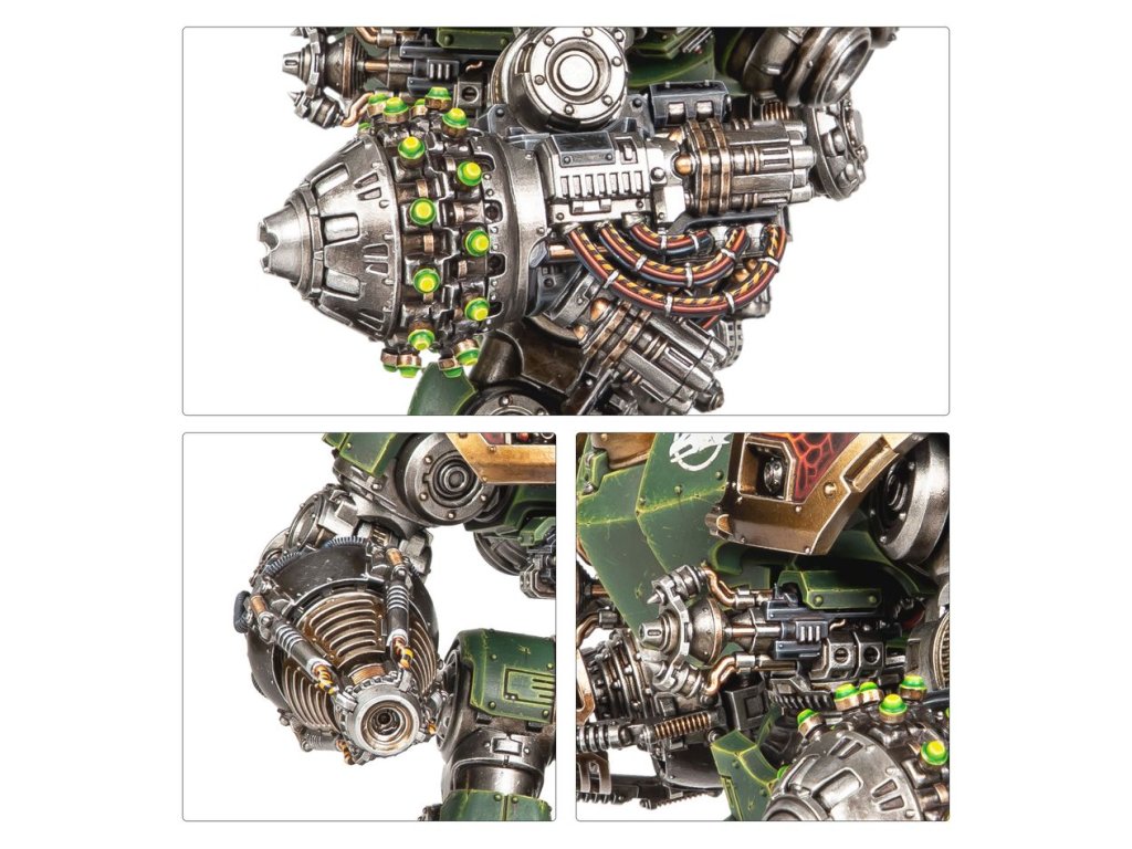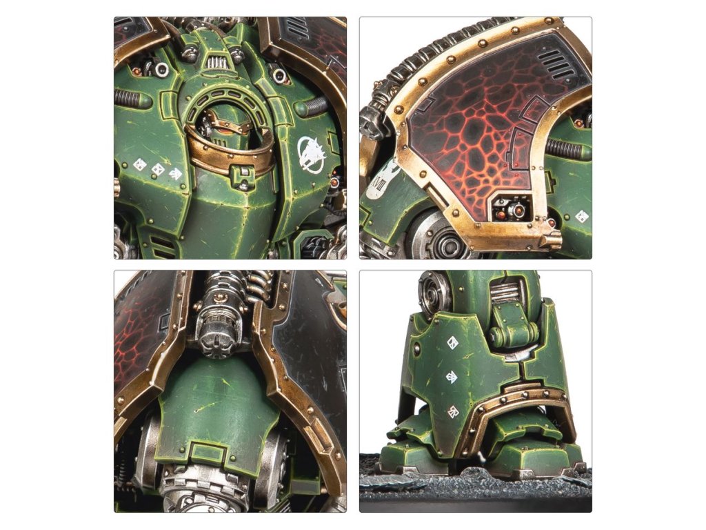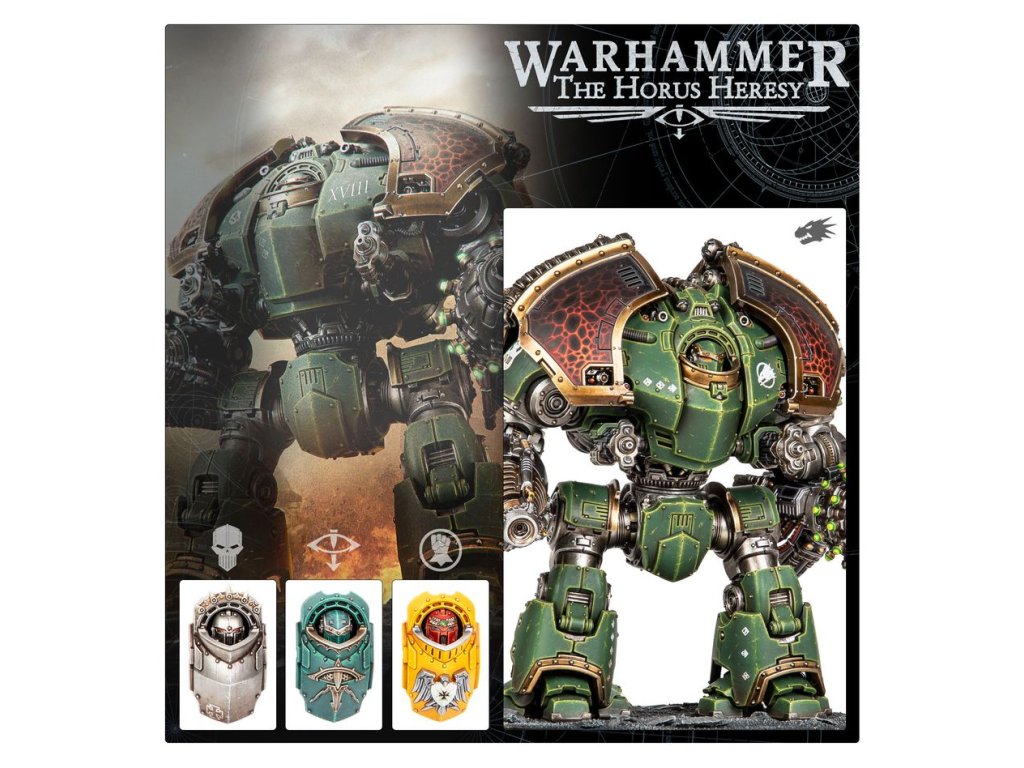 The kit includes four different sarcophagus options, including one Loyalist-themed and one Traitor-themed. Three sets of armour plating, head options, an optional halo, and two sets of leg trim make it easy to customise your mighty war machine.