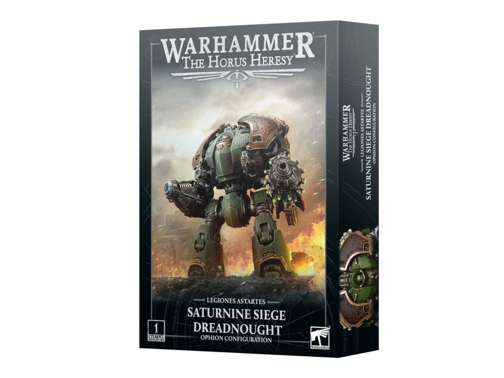 Tato vícedílná plastová stavebnice umožňuje postavit jeden Saturnin Siege Dreadnought, mocný válečný stroj armád Legiones Astartes ve hrách Warhammer: The Horus Heresy. Jejich silný pancíř a pokročilé stínění absorbují pozoruhodné množství přicházející palebné síly, takže je neuvěřitelně obtížné je zničit. Konfigurace Ophion je vybavena pro boj zblízka, a to jak inverzním paprskem, tak gravitonovým drtičem ničícím vozidla, a také hrudními drtiči těžkých částic pro zničení blízké pěchoty.