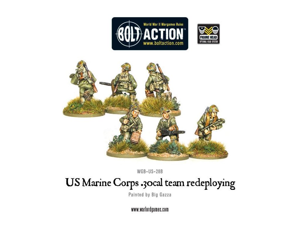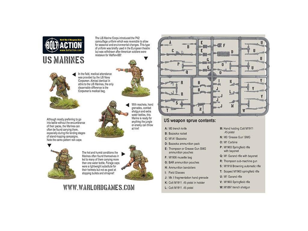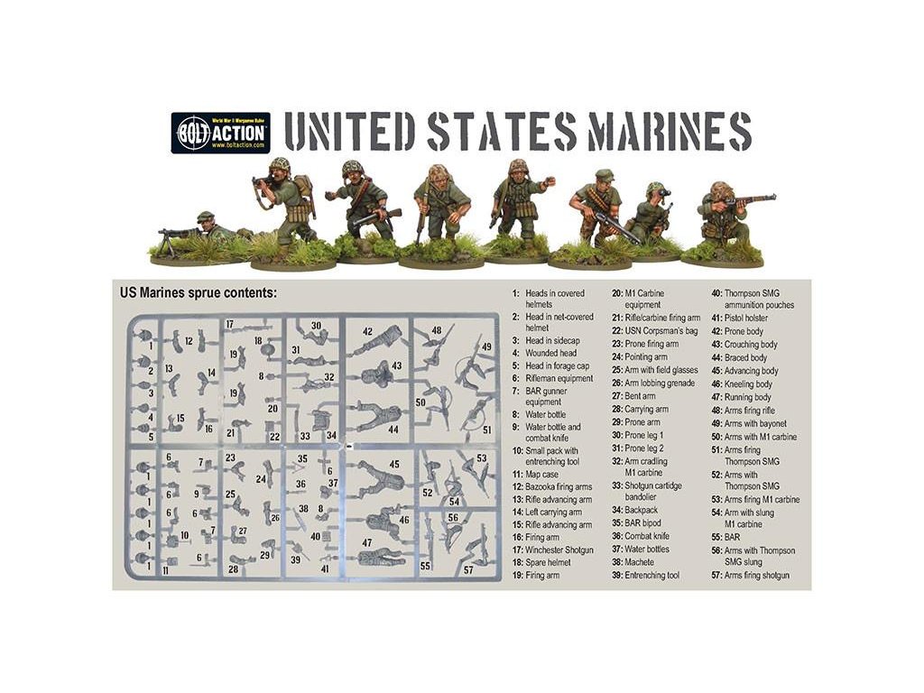 7 rámečků amerických námořních mariňáků a 2 rámečky amerických zbraní - dostatek materiálu pro sestavení 42 pěšáků, včetně velitelských modelů, samopalů, brokovnic, BARů, bazuek a pušk s puškohledem pro odstřelovací týmy