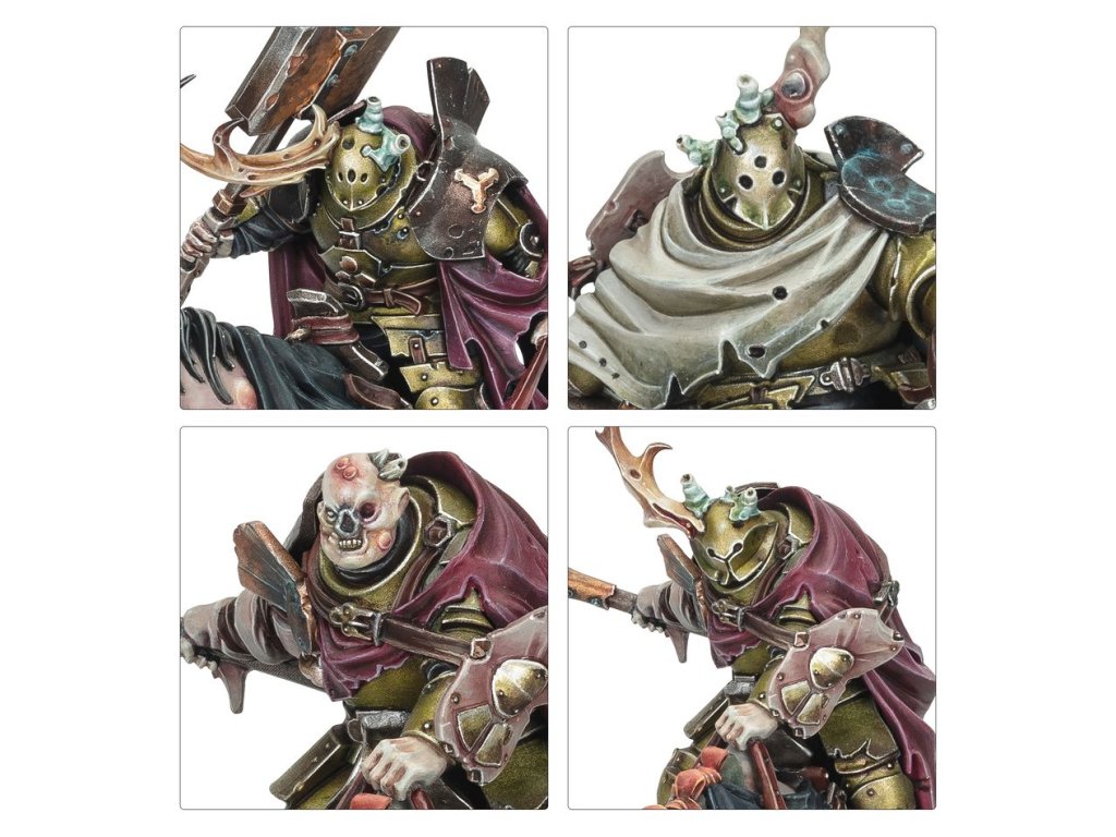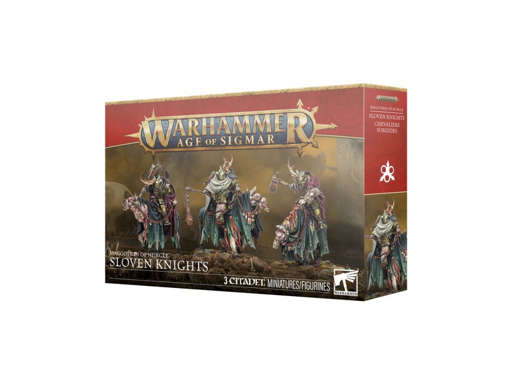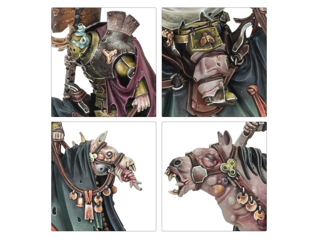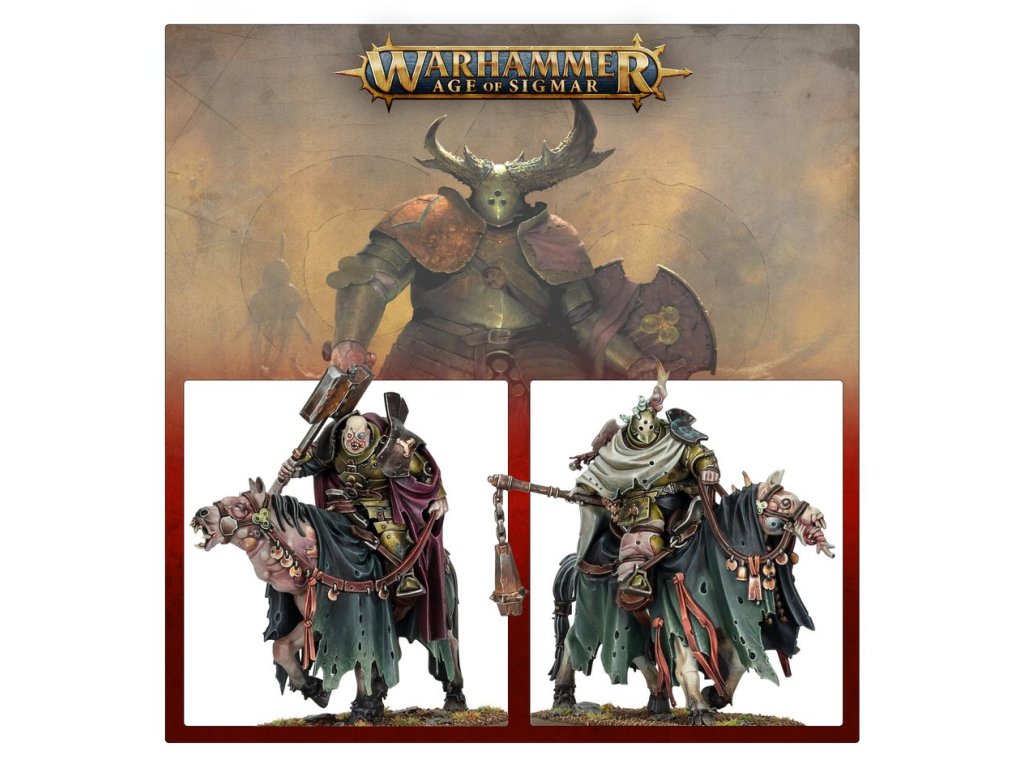 Sloven Knights have turned their backs on whatever honour they might once have possessed. Now these diseased cavaliers clad in rotting panoply are sworn to the Grandfather. They are imposing figures atop their plague-ridden steeds, their very presence exuding a palpable and debilitating aura of despair.