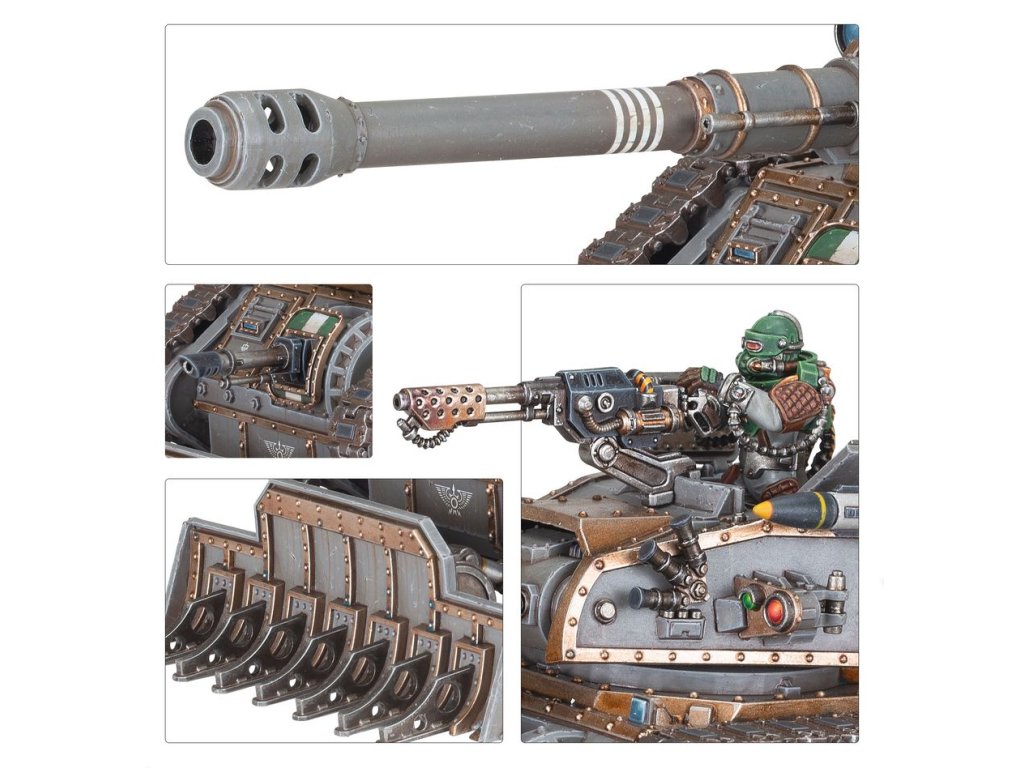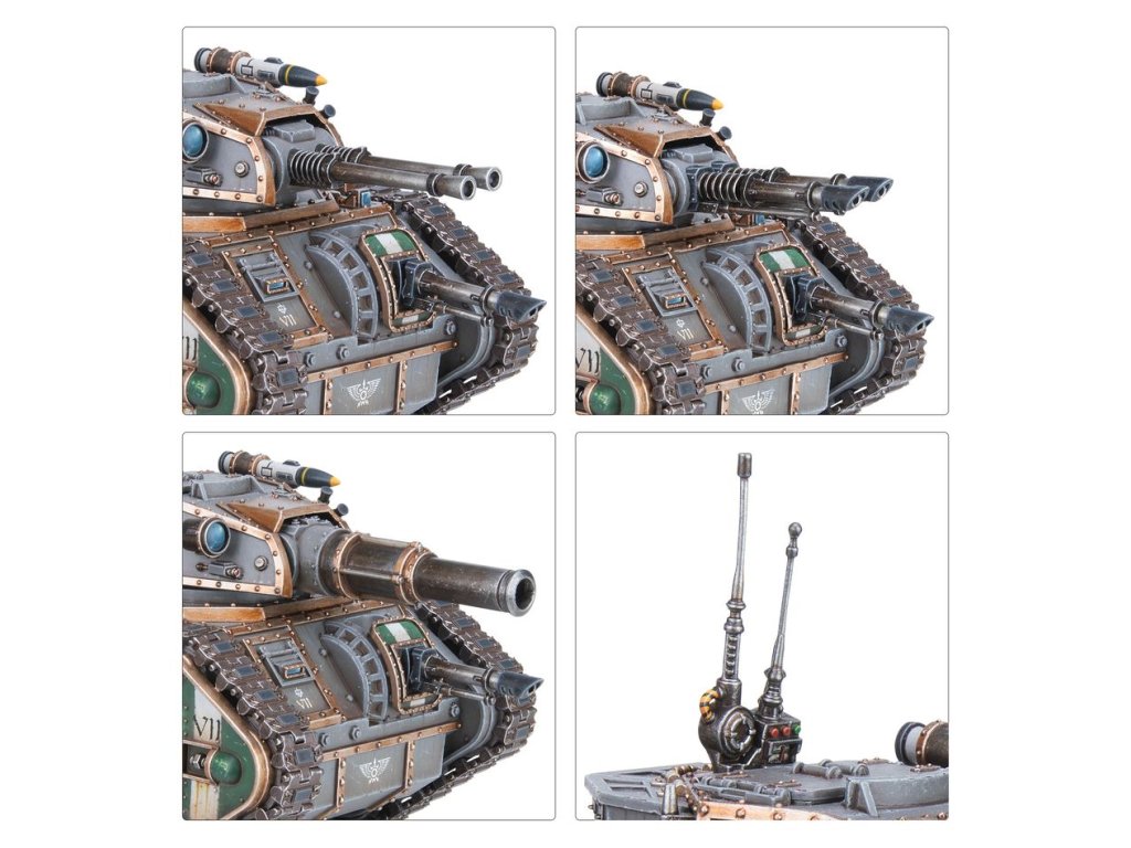 Úderný tank Leman Russ může být vyzbrojen jednou ze čtyř věžových zbraní – bitevním kanónem, dvojitým laserovým kanónem, gravitačním automatickým kanónem nebo kanónem Vanquisher s koaxiálně montovaným těžkým stupberem. Můžete si také vybrat z pěti různých zbraní montovaných na trup – těžkým bolterem, laserovým kanónem, automatickým kanónem, multilaserem nebo těžkým plamenometem. K dispozici je volitelná střela Hunter-Killer, světlomety a dozerová radlice, spolu s těžkým plamenometem, multilaserem nebo těžkým stupberem montovaným na čep. K dispozici je také kognis-signum pro upgrade na velitelský tank a volitelný světlicový štít, pokud se tak rozhodnete.